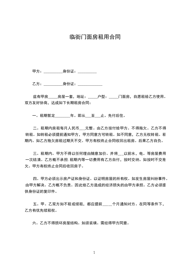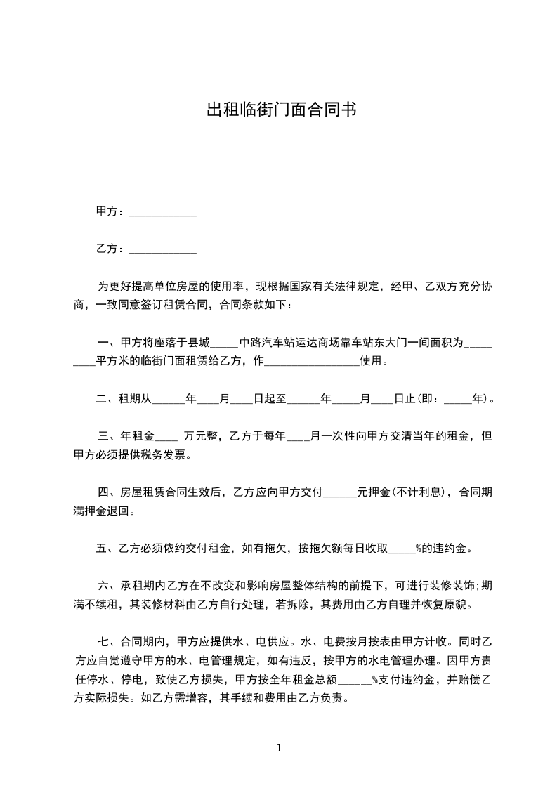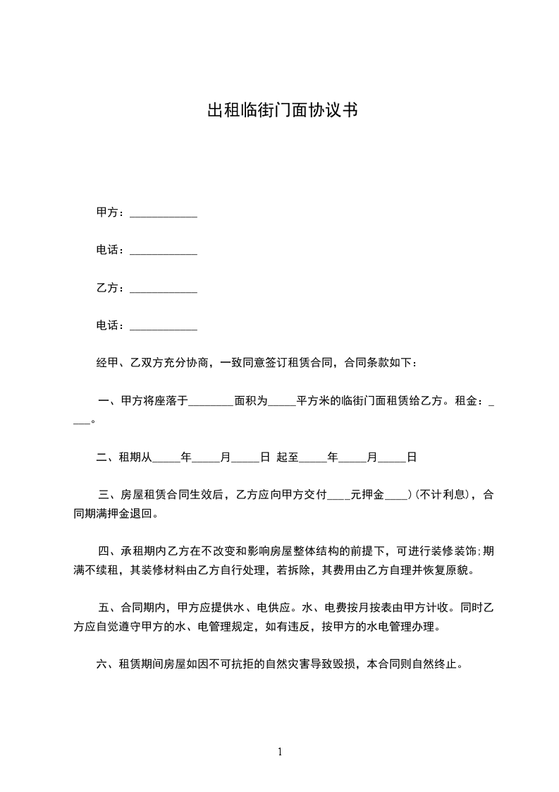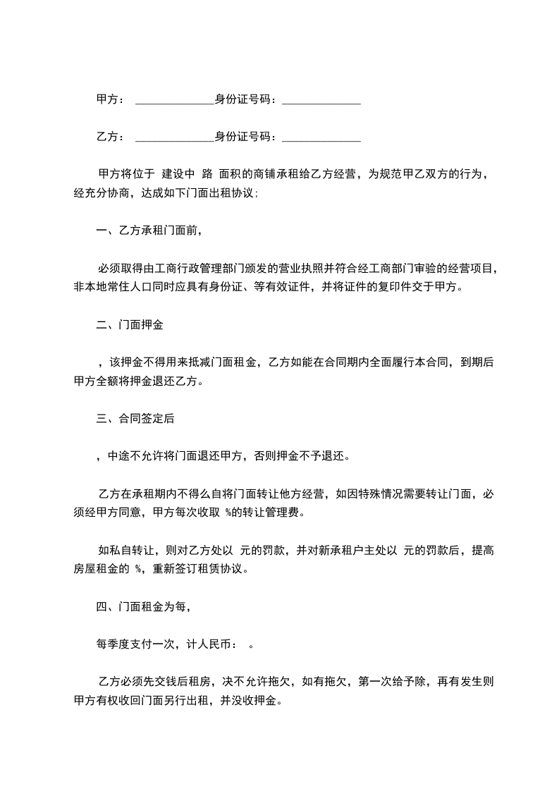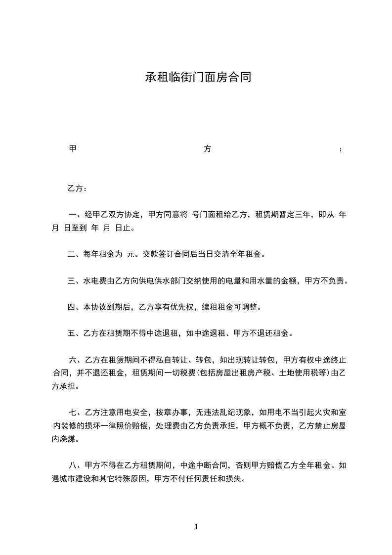 一、经甲乙双方协定,甲方同意将 号门面租给乙方,租赁期暂定三年,即从 年 月 日至到 年 月 日止。