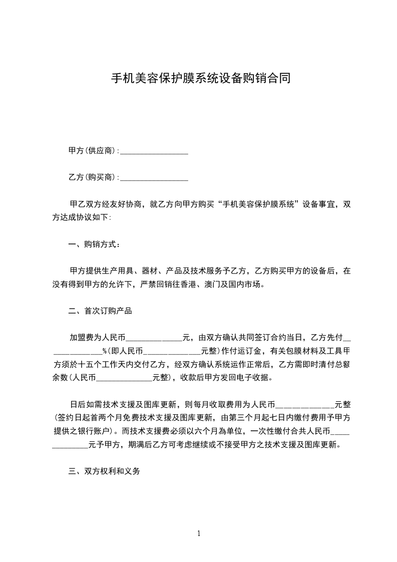 甲乙双方经友好协商,就乙方向甲方购买“手机美容保护贴系统”设备事宜,双方达成协议如下: