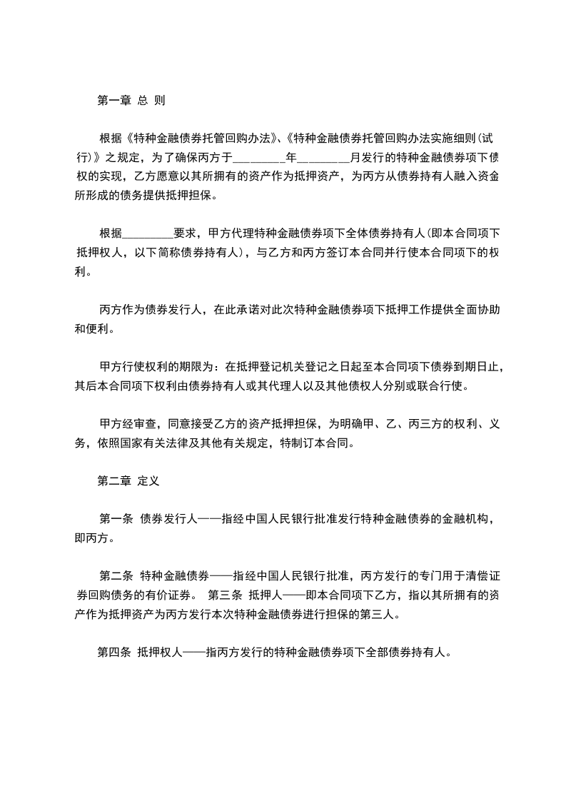 第二条 特种金融债券——指经中国人民银行批准,丙方发行的专门用于清偿证券回购债务的有价证券。 第三条 抵押人——即本合同项下乙方,指以其所拥有的资产作为抵押资产为丙方发行本次特种金融债券进行担保的第三人。