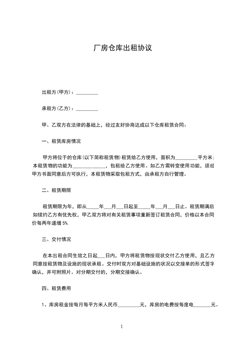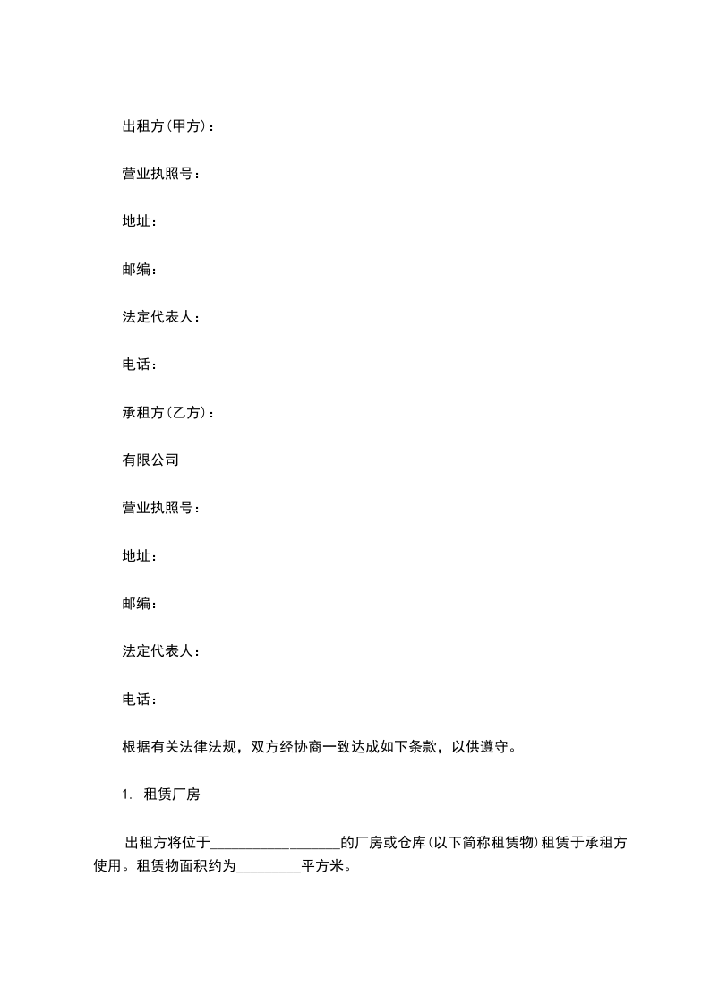 出租方将位于__________________的厂房或仓库(以下简称租赁物)租赁于承租方使用。租赁物面积约为_________平方米。