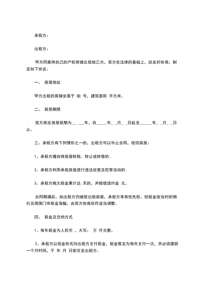 甲方同意将自己的产权商铺出租给乙方,双方在法律的基础上,经友好协商,制定如下协议: