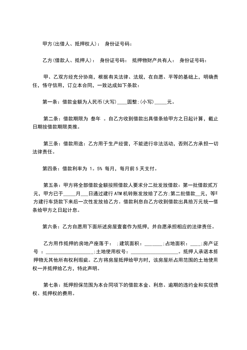 乙方(借款人、抵押人): 身份证号码: 抵押物财产共有人: 身份证号码: