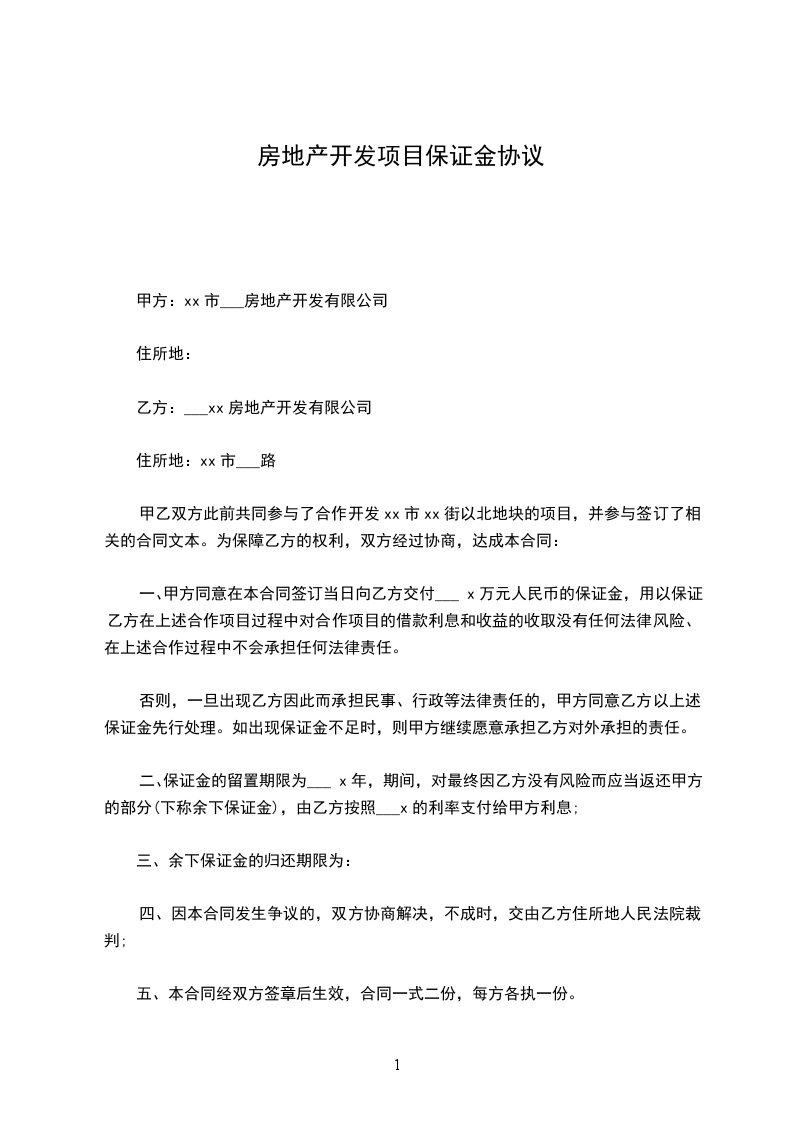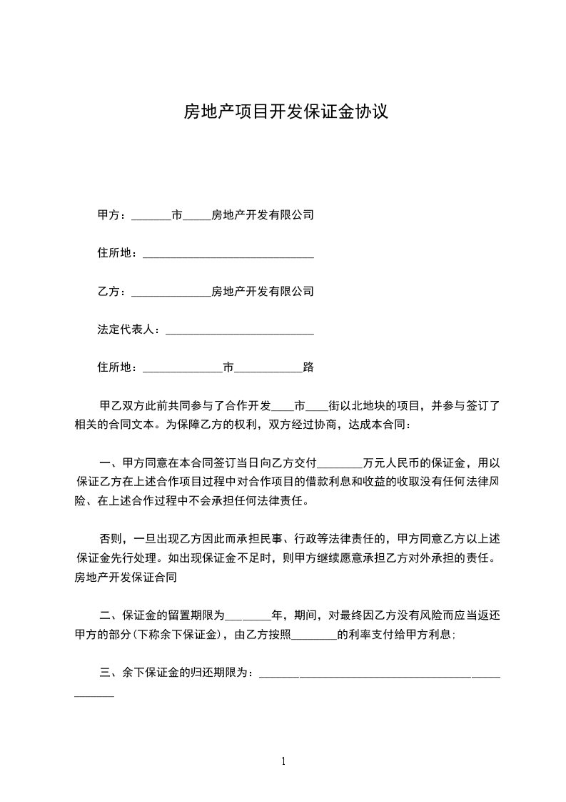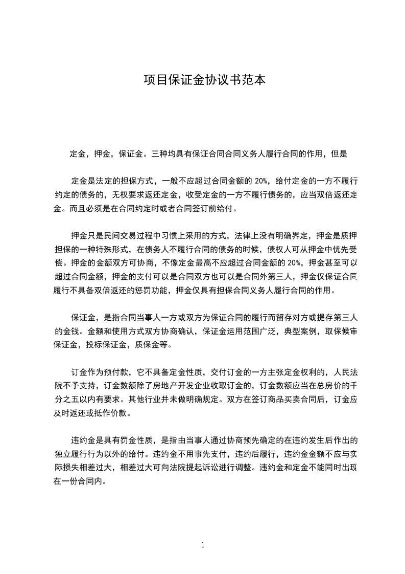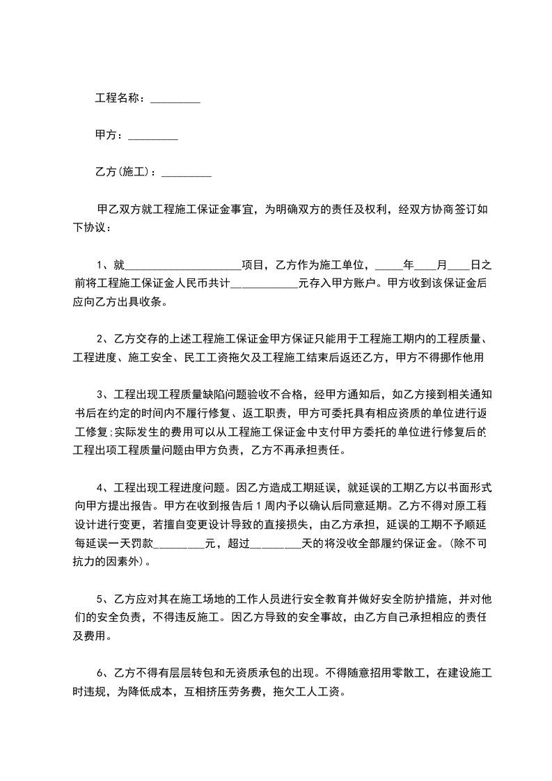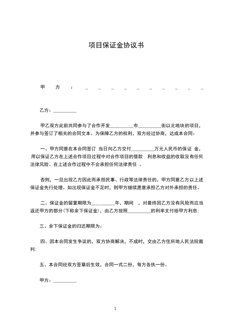 一、甲方同意在本合同签订 当日向乙方交付__________万元人民币的保证 金,用以保证乙方在上述合作项目过程中对合作项目的借款 利息和收益的收取没有任何法律风险、在上述合作过程中不会承担任何法律责任 。