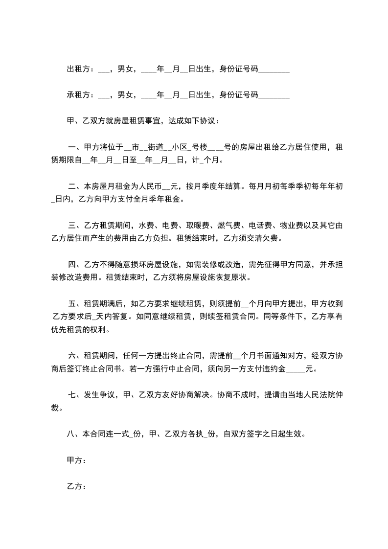 在房屋租赁期间,任何一方提出终止合同,需提前___月书面通知对方,经双方协商后签订终止合同书,在终止合同书签订前,本合同仍有效。