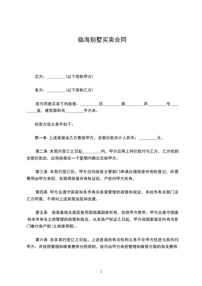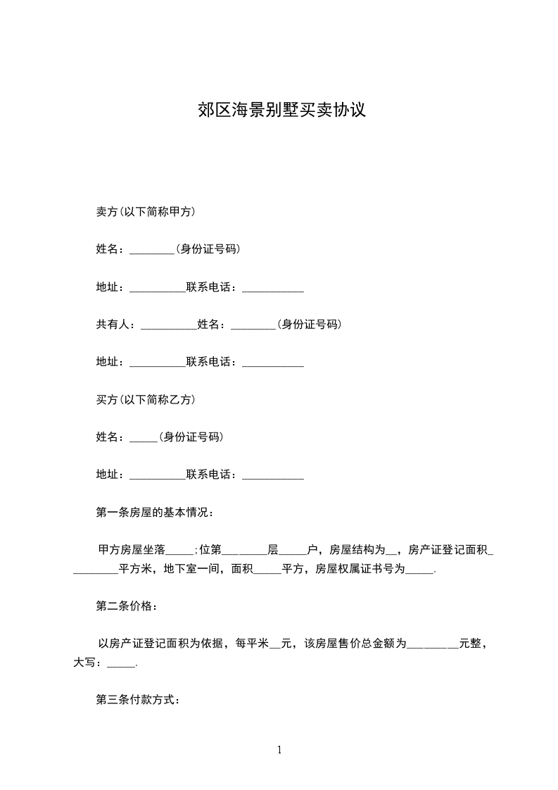 第一条 乙方同意购买甲方拥有的座落在______市_____区________________________拥有的房产(别墅、写字楼、公寓、住宅、厂房、店面),建筑面积为_____平方米。(详见土地房屋权证第_______________号)。
