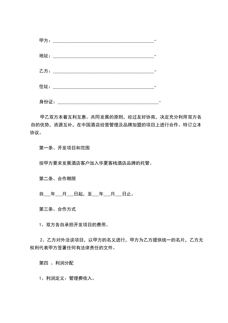 甲乙双方本着互利互惠、共同发展的原则,经过友好协商,决定充分利用双方各自的优势,资源互补,在中国酒店经营管理及品牌加盟的项目上进行合作。特订立本协议。