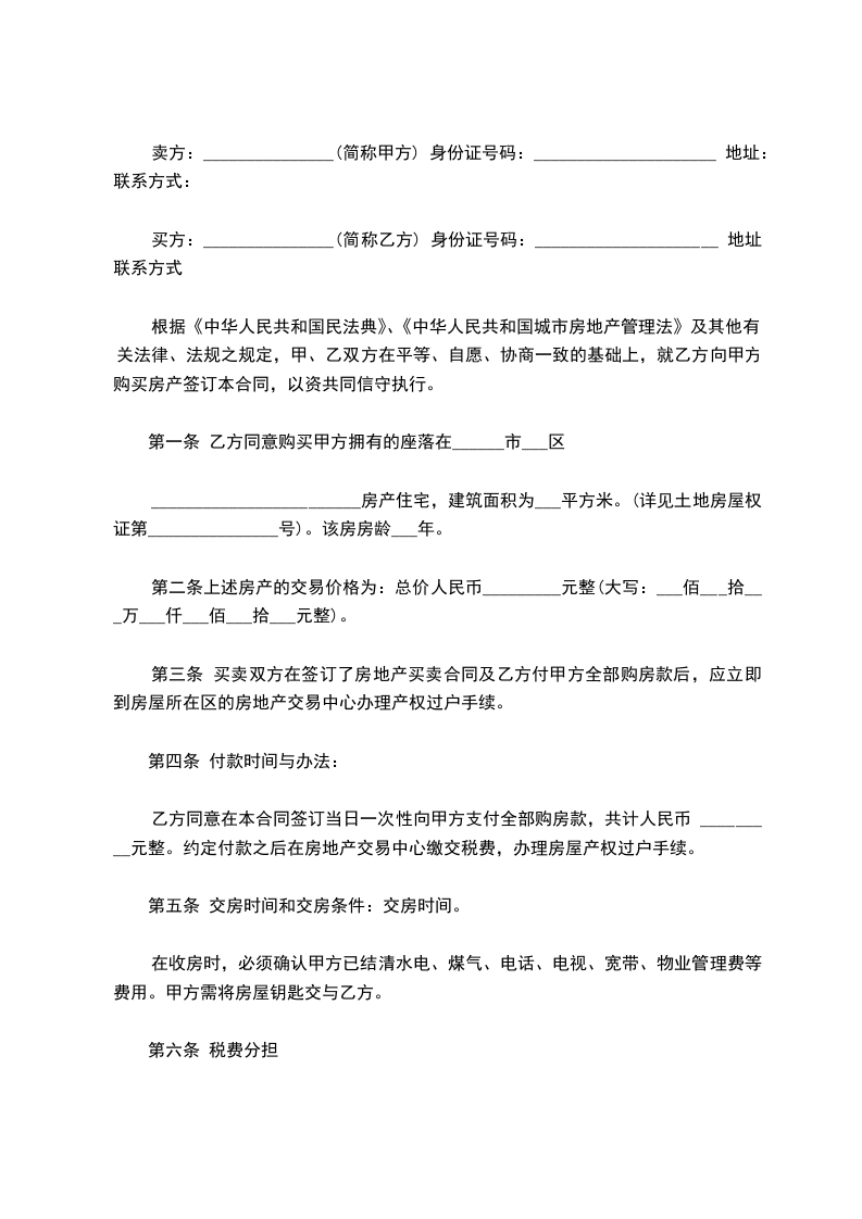 乙方同意在本合同签订当日一次性向甲方支付全部购房款,共计人民币 _________元整。约定付款之后在房地产交易中心缴交税费,办理房屋产权过户手续。