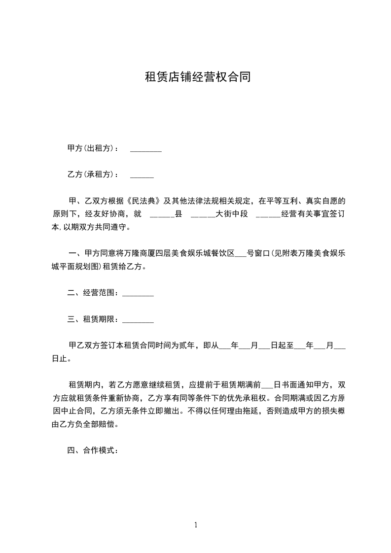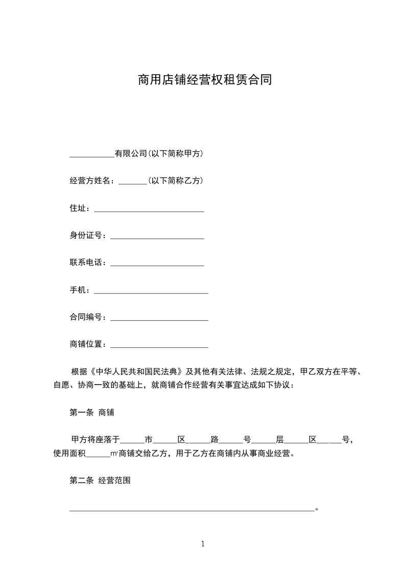 根据《中华人民共和国民法典》及其他有关法律、法规之规定,甲乙双方在平等、自愿、协商一致的基础上,就商铺合作经营有关事宜达成如下协议: