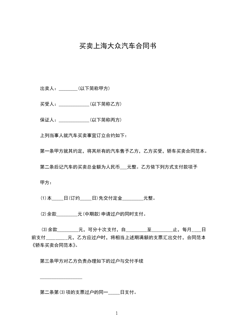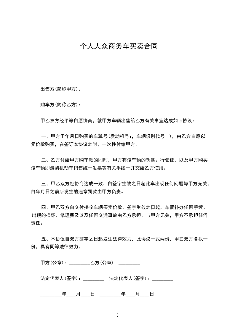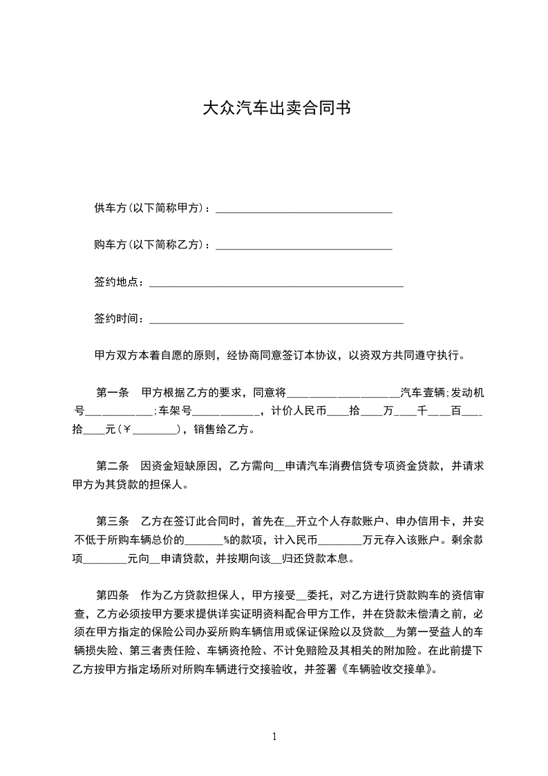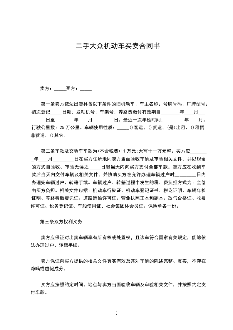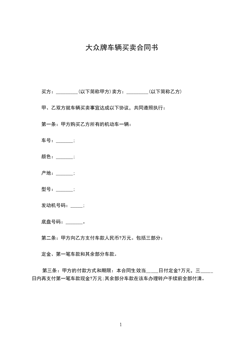 一、甲方于_____年_____月_____日购买的车冀号(发动机号:,车辆识别代号:),由乙方自愿以元价款购买,在签订本协议之时,一次性付给甲方。
