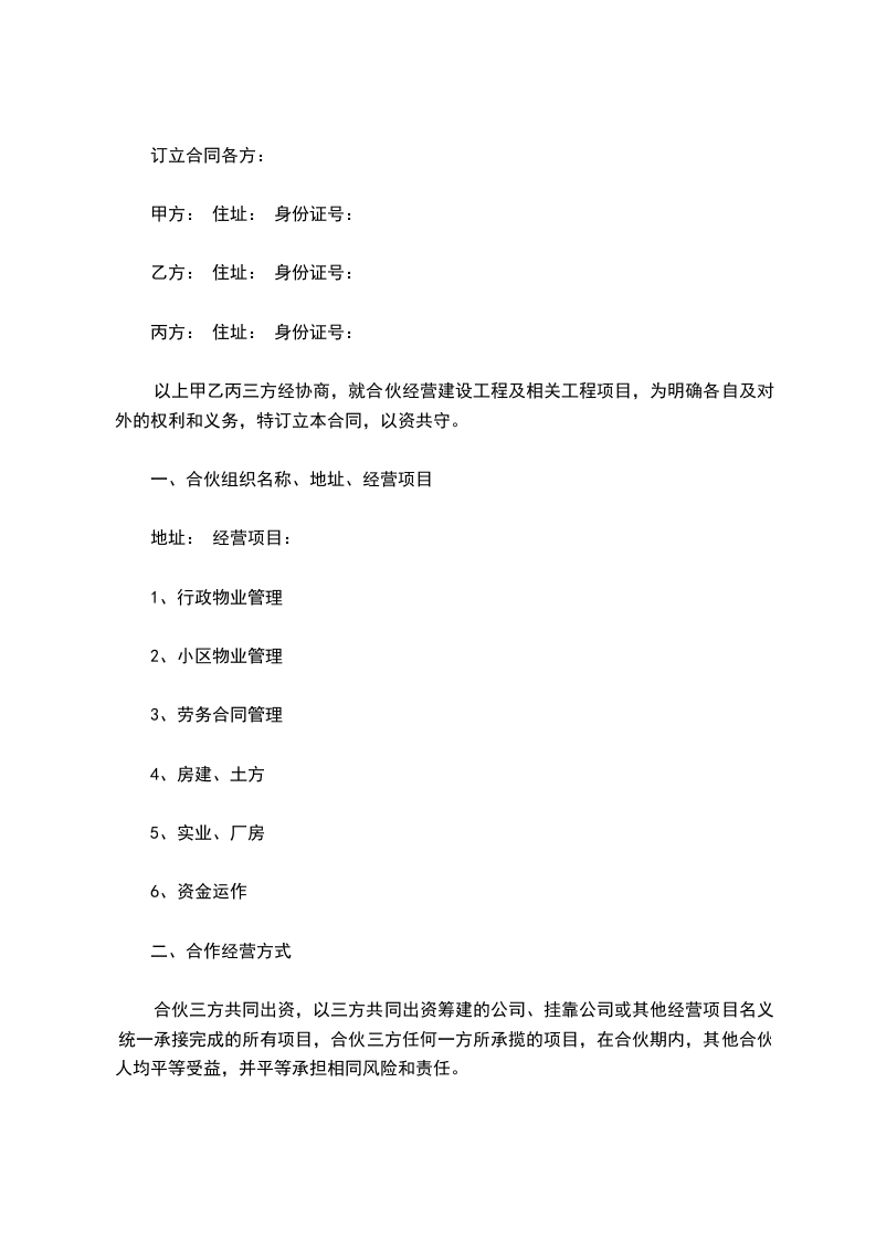 以上甲乙丙三方经协商,就合伙经营建设工程及相关工程项目,为明确各自及对外的权利和义务,特订立本合同,以资共守。