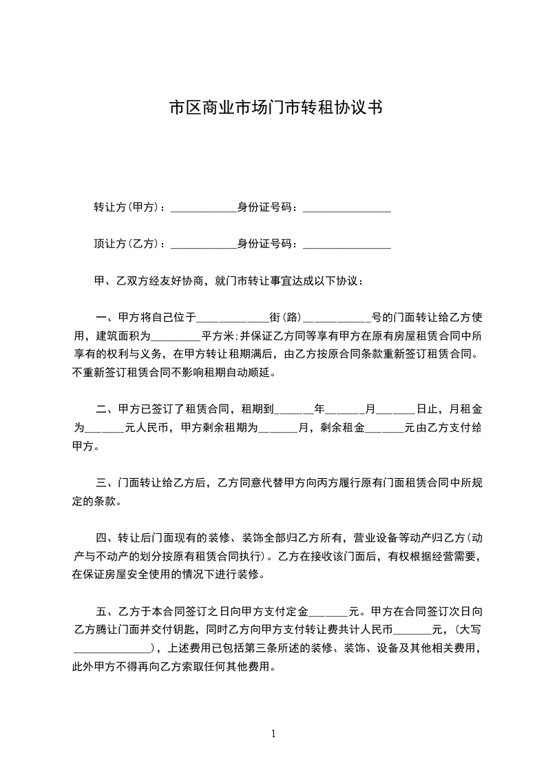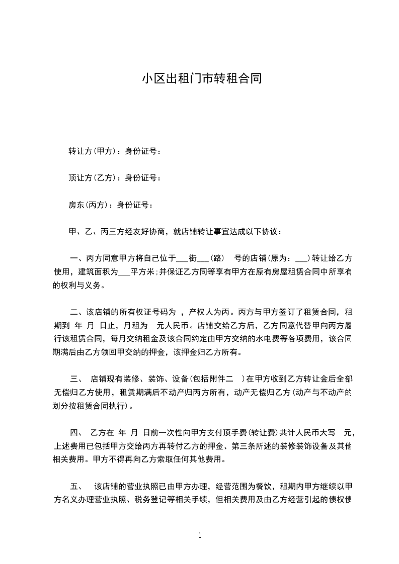 一、丙方同意甲方将自己位于___街___(路) 号的店铺(原为:___)转让给乙方使用,建筑面积为___平方米;并保证乙方同等享有甲方在原有房屋租赁合同中所享有的权利与义务。