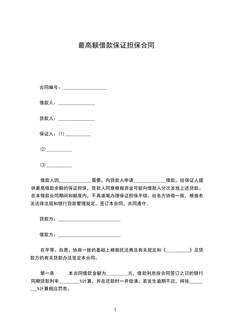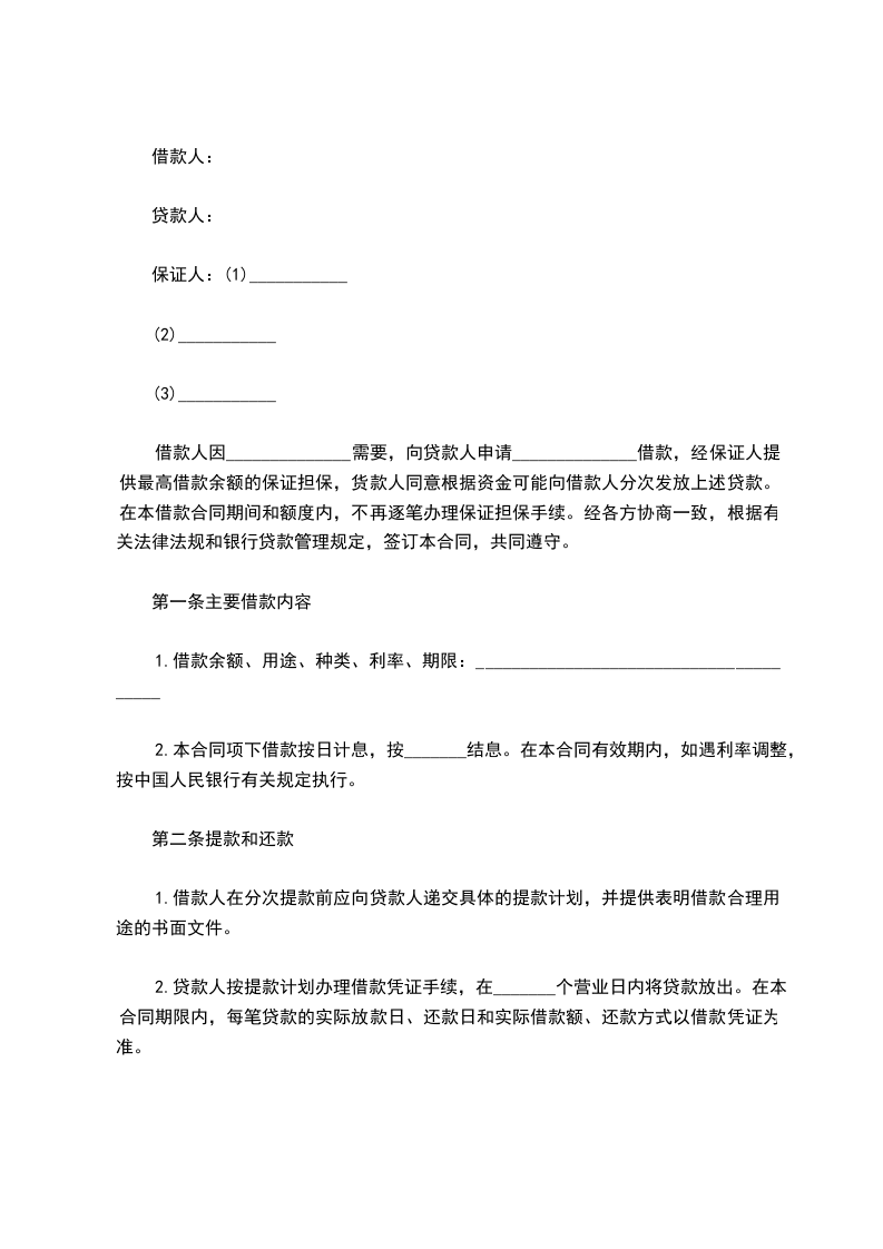 借款人因______________需要,向贷款人申请______________借款,经保证人提供最高借款余额的保证担保,货款人同意根据资金可能向借款人分次发放上述贷款。在本借款合同期间和额度内,不再逐笔办理保证担保手续。经各方协商一致,根据有关法律法规和银行贷款管理规定,签订本合同,共同遵守。