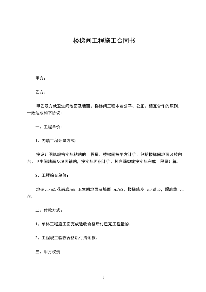 甲乙双方就卫生间地面及墙面、楼梯间工程本着公平、公正、相互合作的原则,一致达成如下协议: