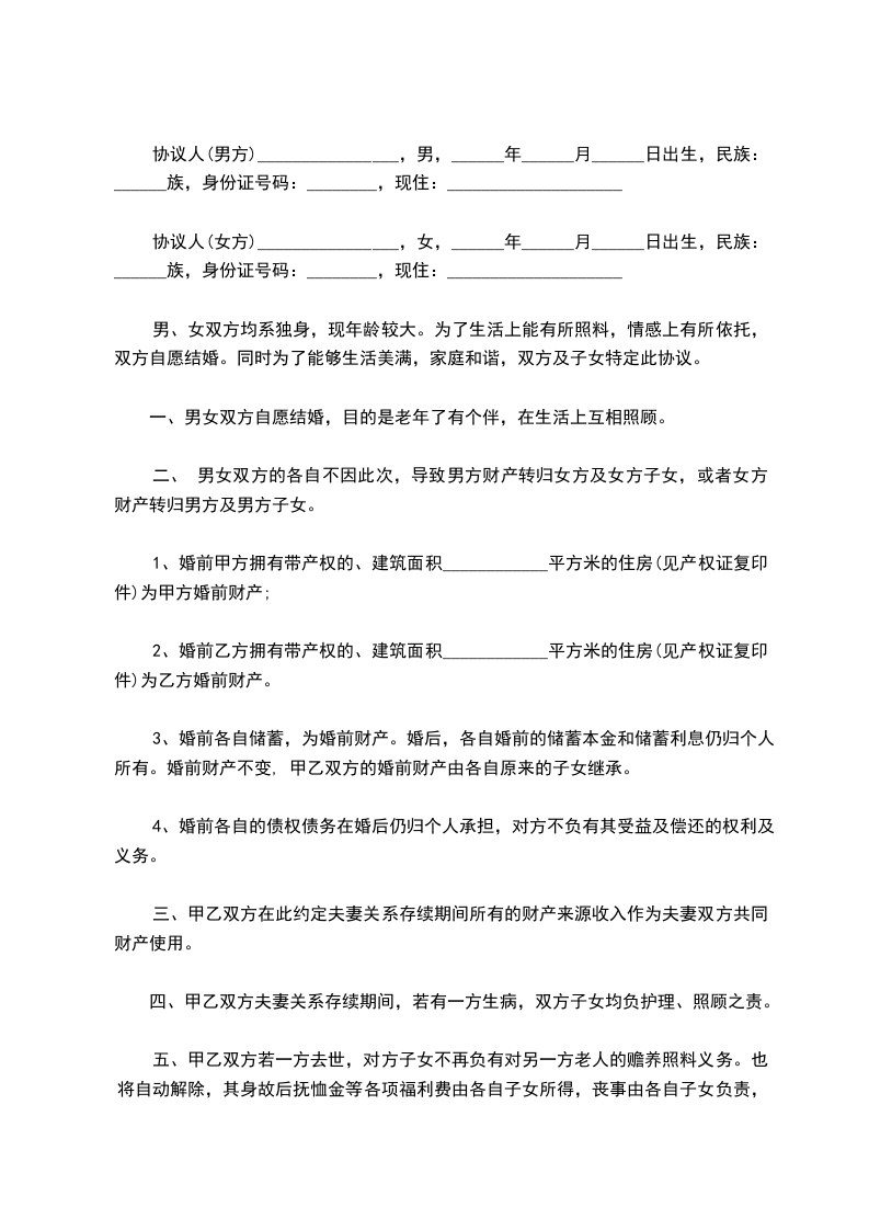 男、女双方均系独身,现年龄较大。为了生活上能有所照料,情感上有所依托,双方自愿结婚。同时为了能够生活美满,家庭和谐,双方及子女特定此协议。