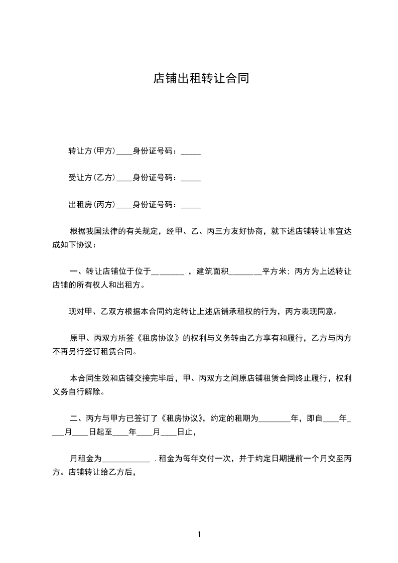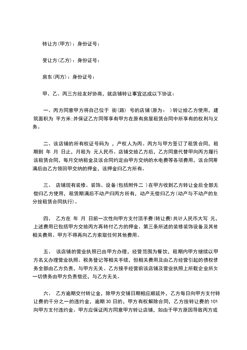 甲、乙、丙三方经友好协商,就店铺转让事宜达成以下协议: