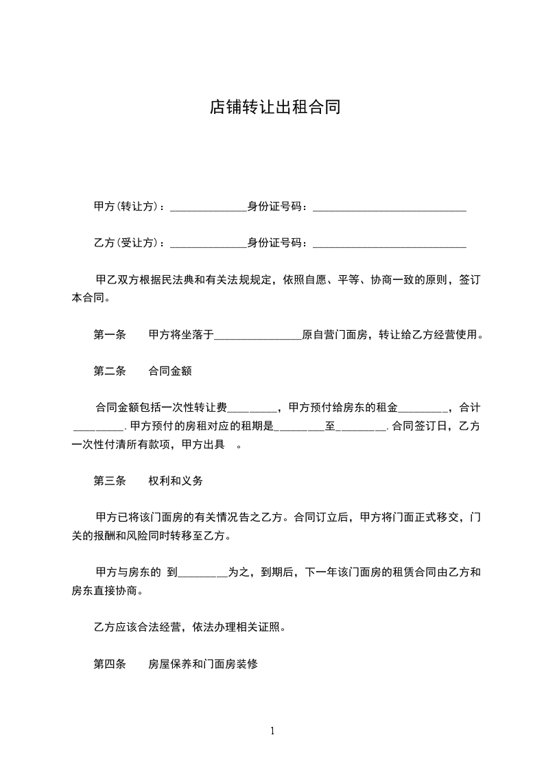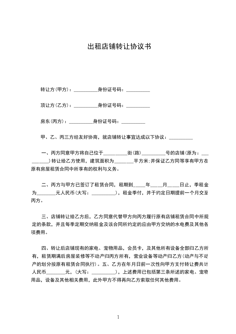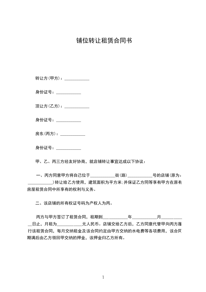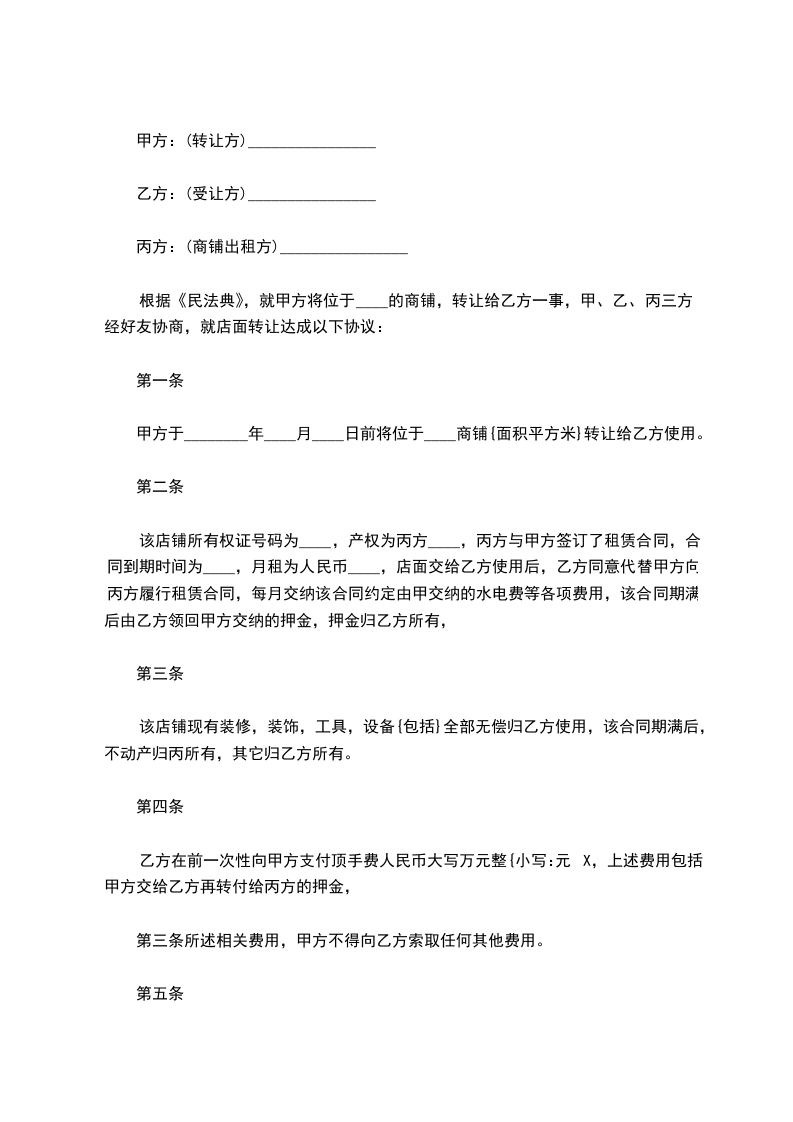 一、丙方同意甲方将自己位于 街(路) 号的店铺(原为: )转让给乙方使用,建筑面积为 平方米;并保证乙方同等享有甲方在原有房屋租赁合同中所享有的权利与义务。