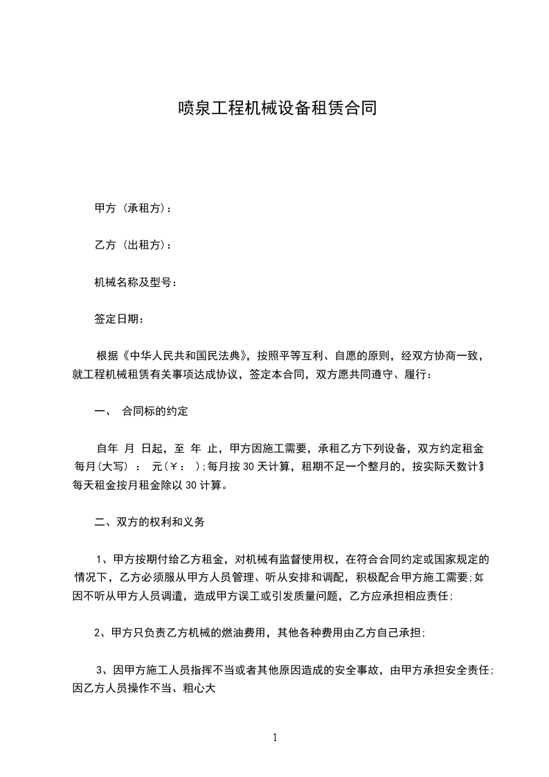 根据《中华人民共和国民法典》,按照平等互利、自愿的原则,经双方协商一致,就工程机械租赁有关事项达成协议,签定本合同,双方愿共同遵守、履行: