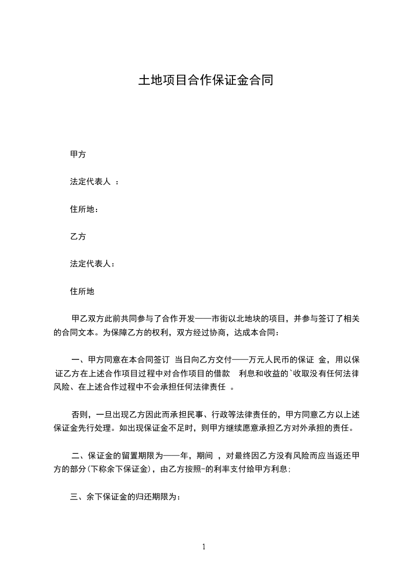 一、甲方同意在本合同签订 当日向乙方交付——万元人民币的保证 金,用以保证乙方在上述合作项目过程中对合作项目的借款 利息和收益的`收取没有任何法律风险、在上述合作过程中不会承担任何法律责任 。