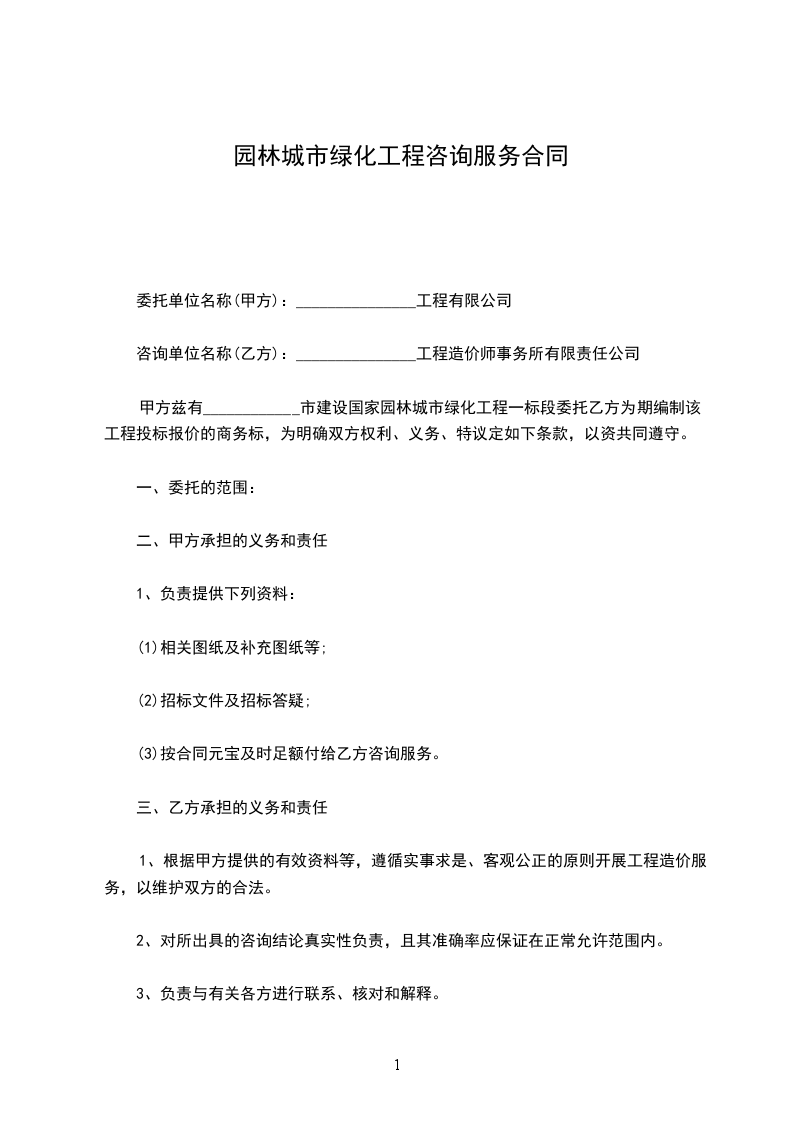 甲方兹有____________市建设国家园林城市绿化工程一标段委托乙方为期编制该工程投标报价的商务标,为明确双方权利、义务、特议定如下条款,以资共同遵守。