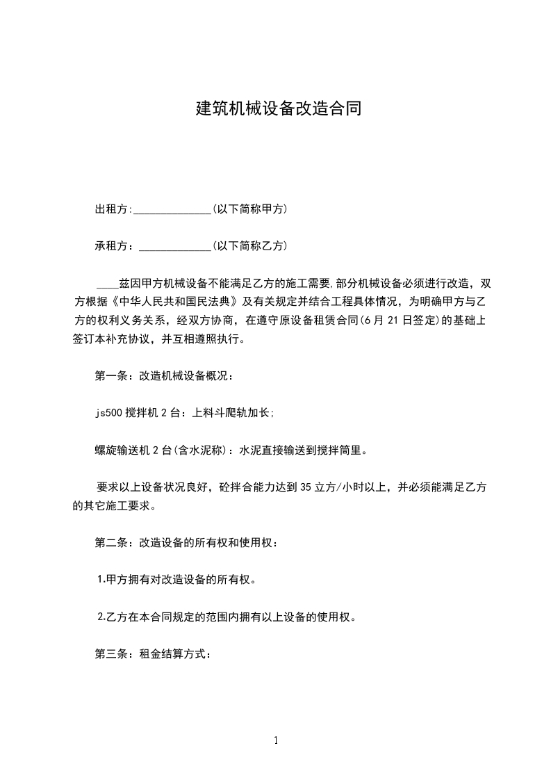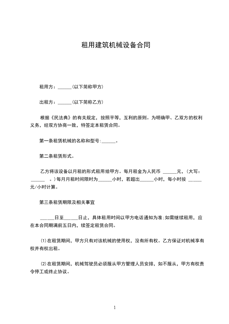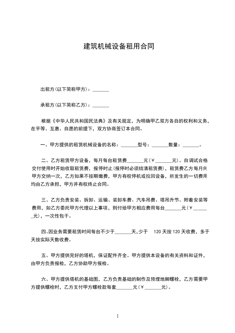 一、乙方因建筑工程需要,租用甲方塔吊、搅拌机、钢管、钢模、扣件、脚手架等及各种动力设备,甲方同意有偿出租给乙方使用(甲方向乙方提供机械设备租赁价目表)。