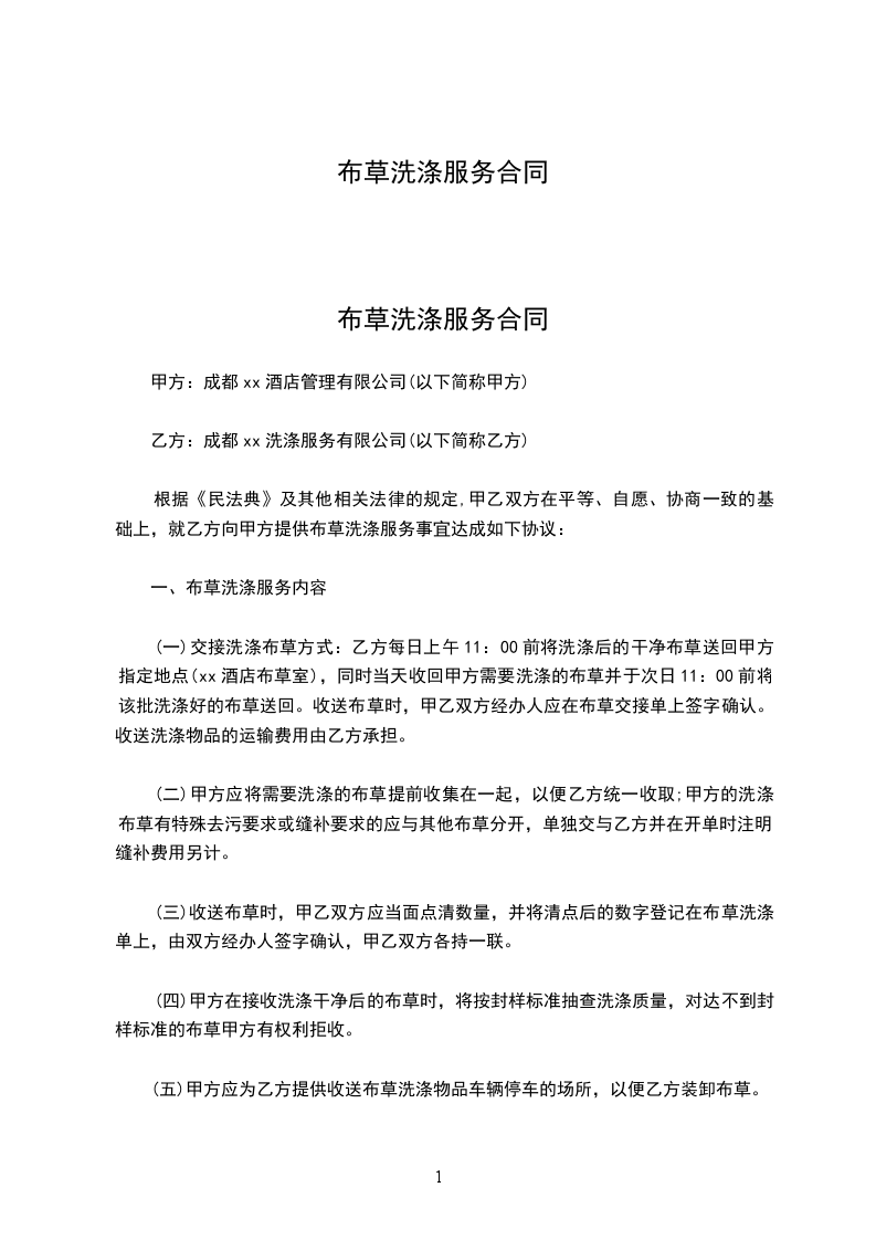 根据《民法典》及其他相关法律的规定,甲乙双方在平等、自愿、协商一致的基础上,就乙方向甲方提供布草洗涤服务事宜达成如下协议: