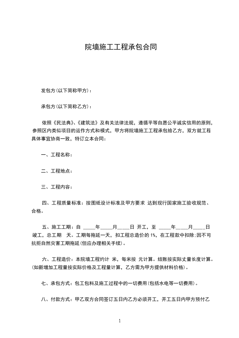 依照《民法典》、《建筑法》及有关法律法规,遵循平等自愿公平诚实信用的原则,参照区内类似项目的运作方式和模式,甲方将院墙施工工程承包给乙方,双方就工程具体事宜协商一致,特订立本合同: