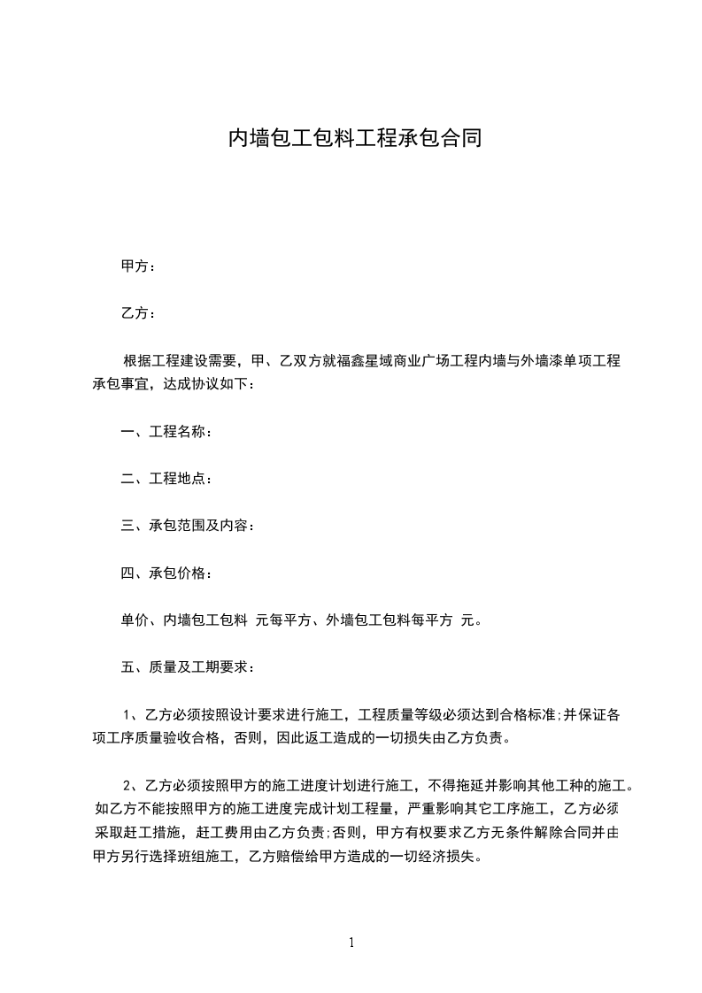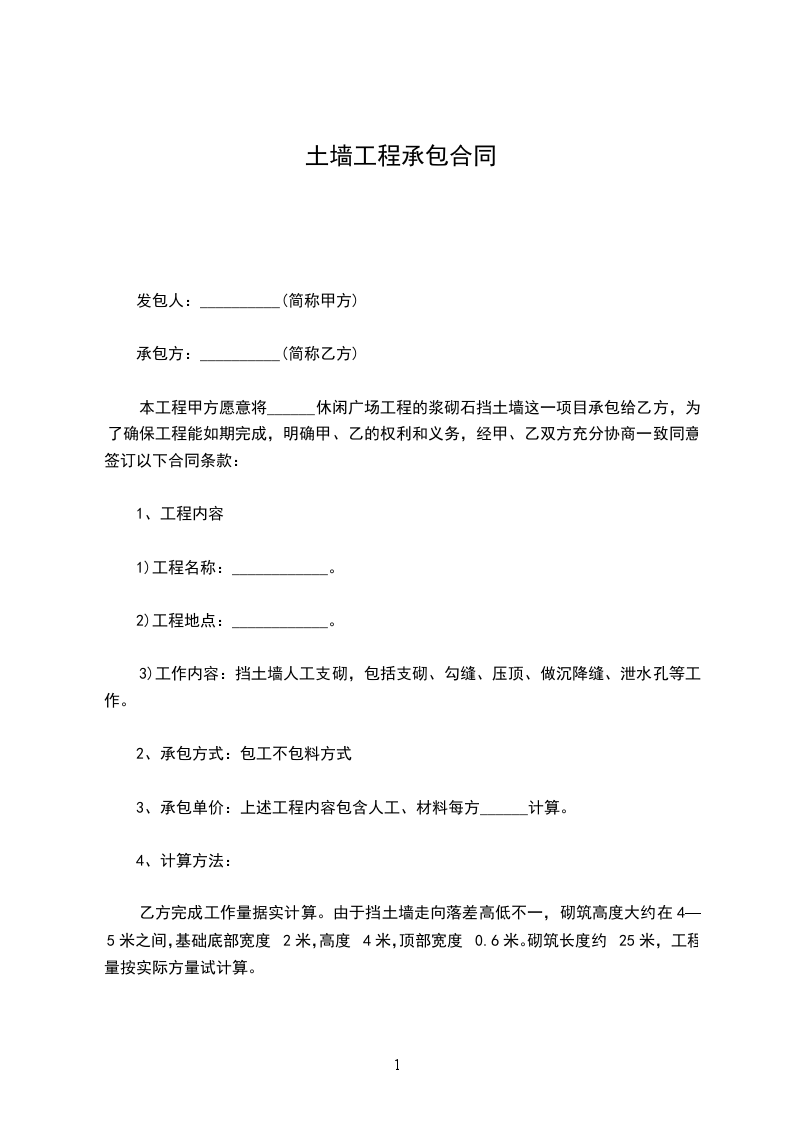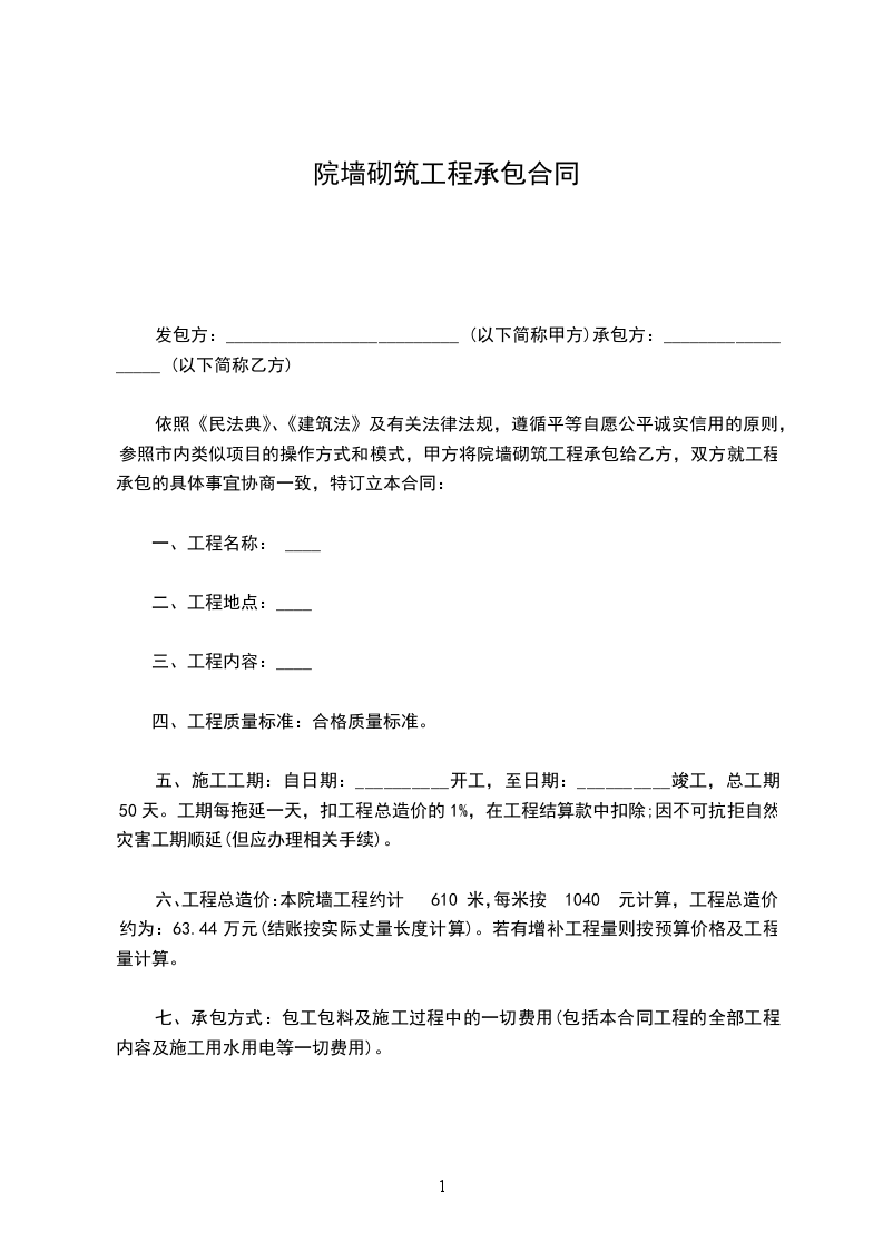 六、工程造价:本院墙工程约计 米,每米按 元计算。结账按实际丈量长度计算。(如新增加工程量按实际价格及工程量计算,乙方需为甲方提供材料价格)。