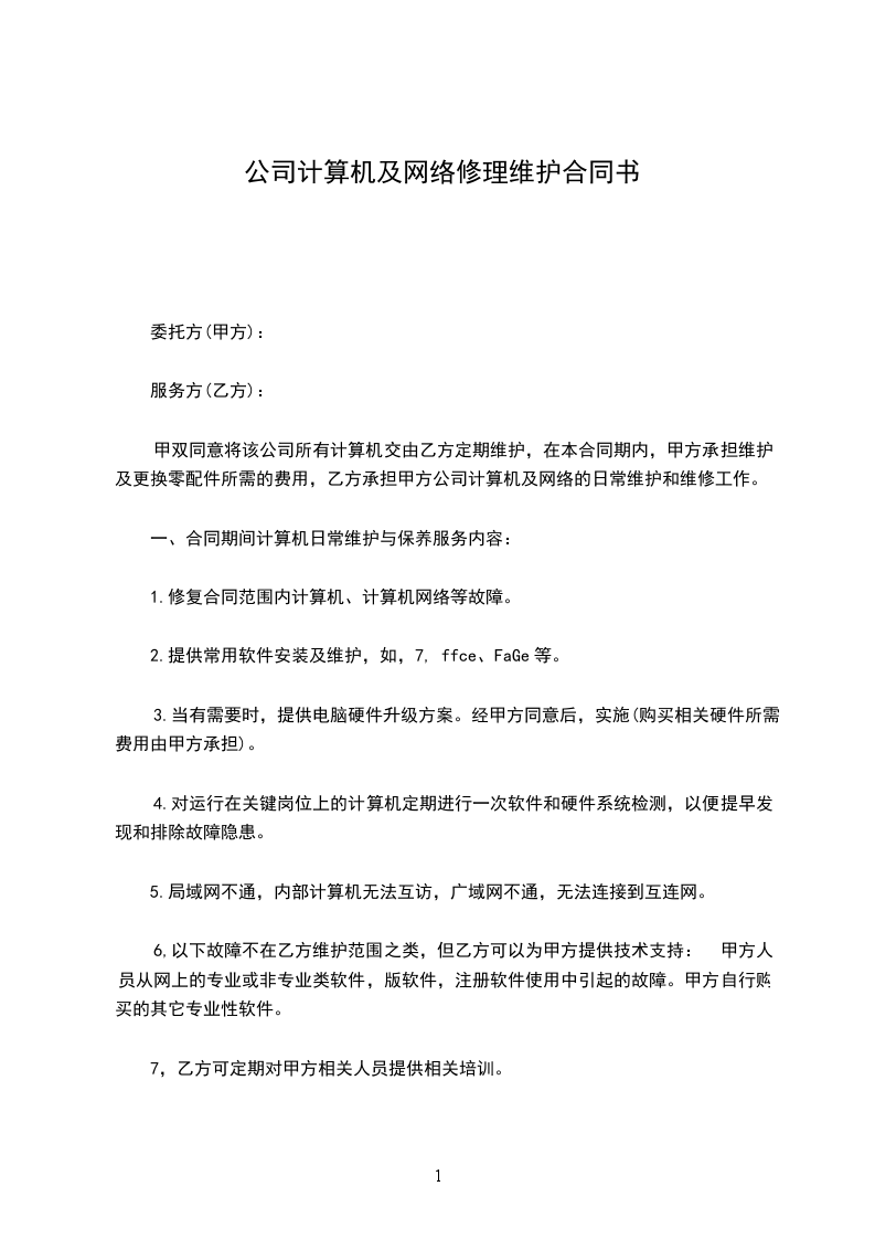 甲双同意将该公司所有计算机交由乙方定期维护,在本合同期内,甲方承担维护及更换零配件所需的费用,乙方承担甲方公司计算机及网络的日常维护和维修工作。