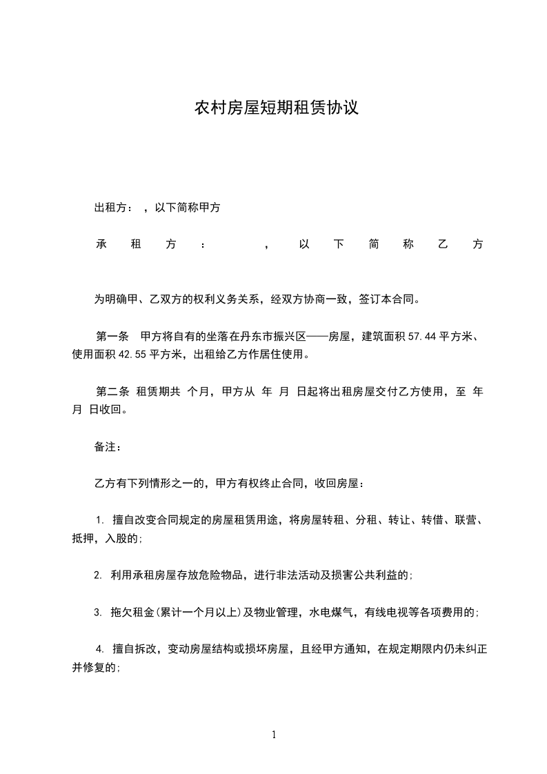 第一条 甲方将自有的坐落在丹东市振兴区——房屋,建筑面积57.44平方米、使用面积42.55平方米,出租给乙方作居住使用。