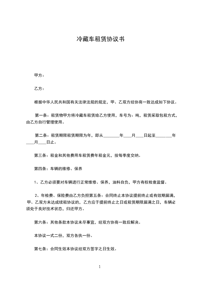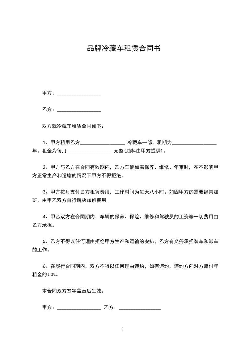 1、甲方租用乙方__________________ 冷藏车一部,租期为__________________ 年。租金为每月__________________ 元整(油料由甲方提供)。