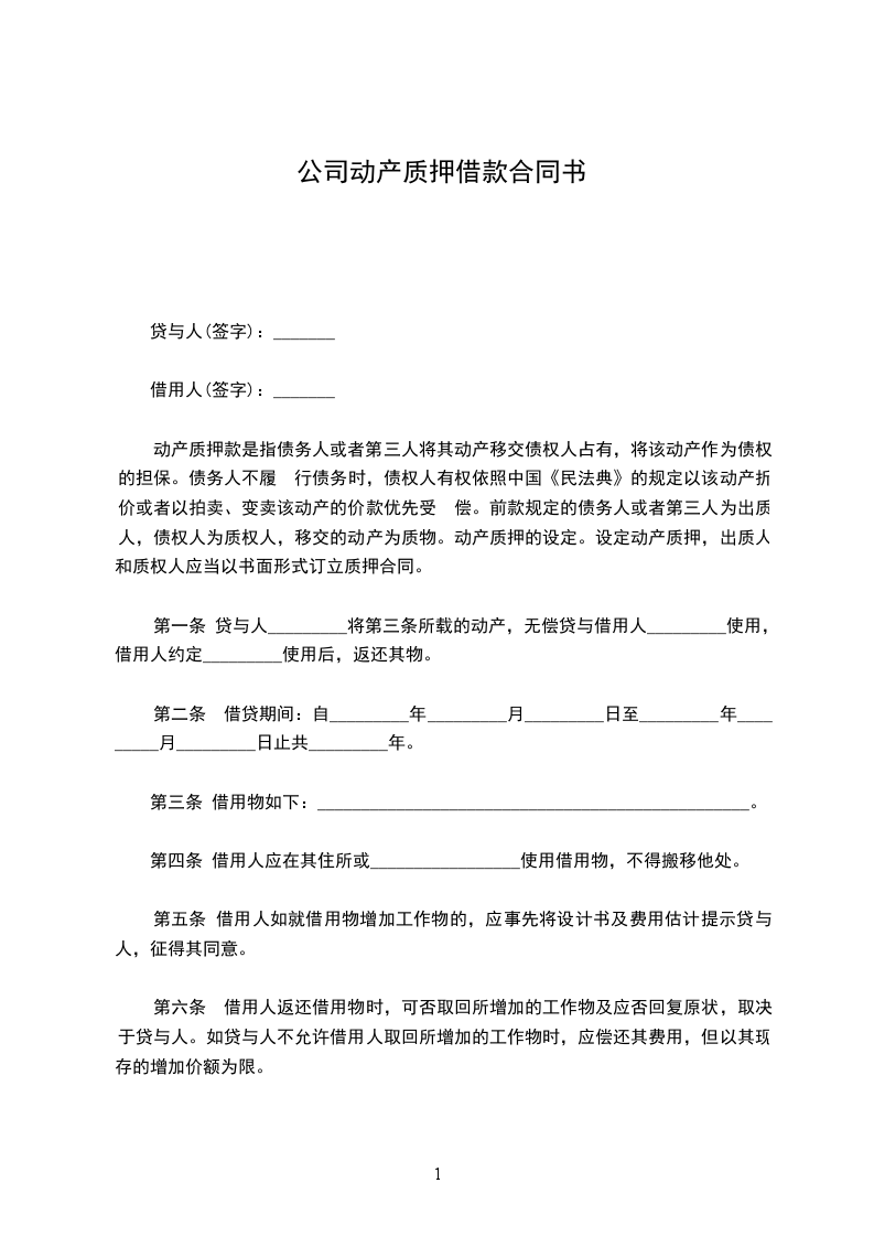 第一条 贷与人_________将第三条所载的动产,无偿贷与借用人_________使用,借用人约定_________使用后,返还其物。