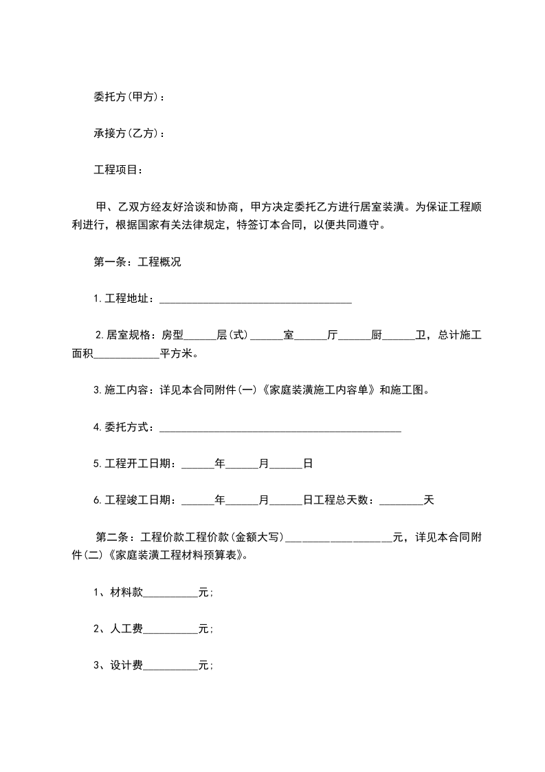 第二条:工程价款工程价款(金额大写)___________________元,详见本合同附件(二)《家庭装潢工程材料预算表》。