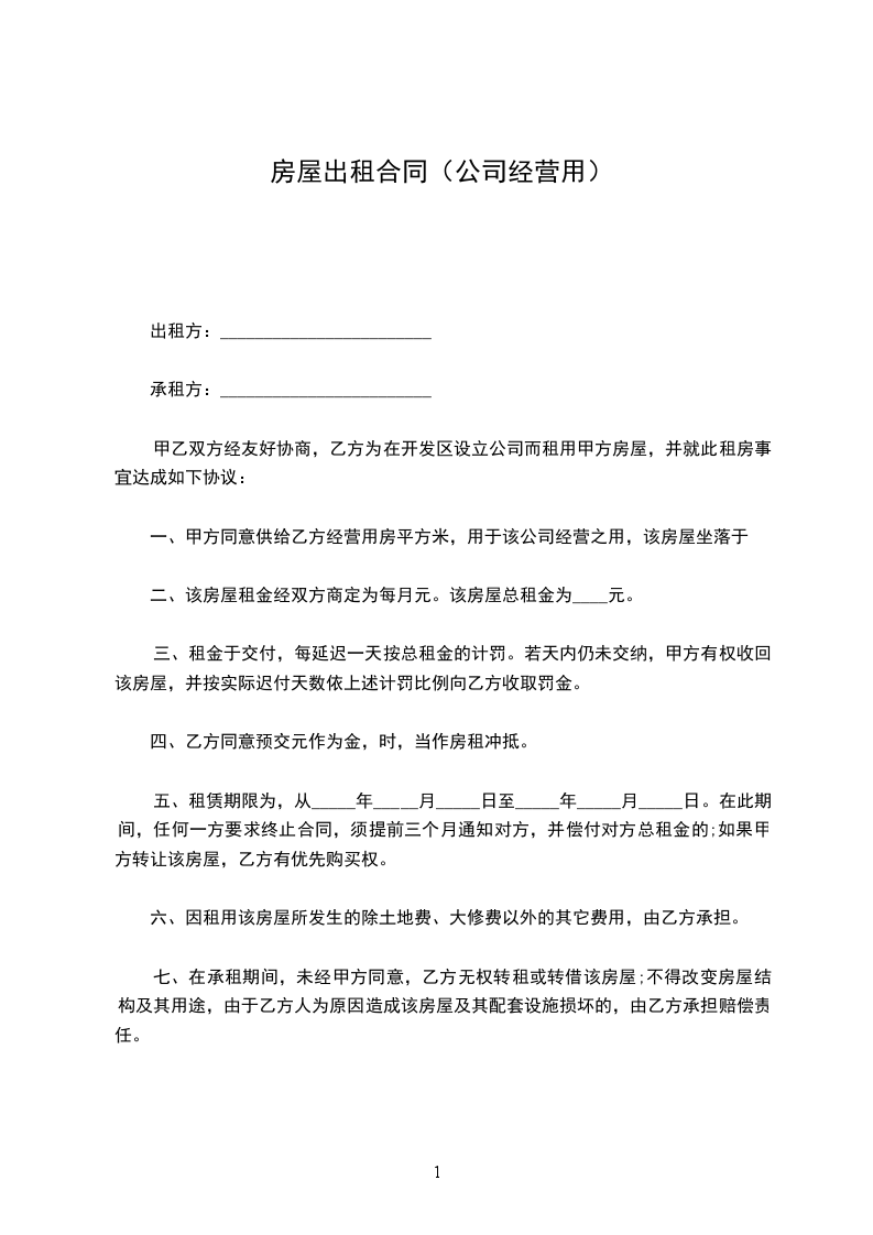 一、甲方同意供给乙方经营用房平方米,用于该公司经营之用,该房屋坐落于