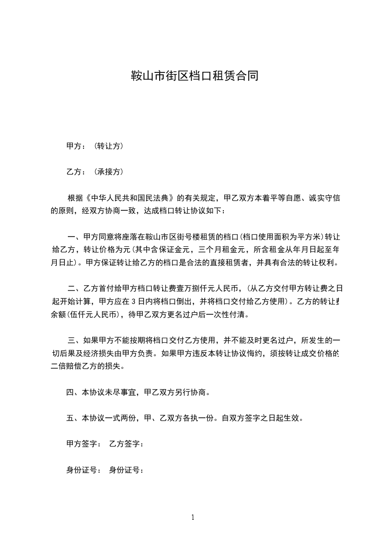 一、甲方同意将座落在鞍山市区街号楼租赁的档口(档口使用面积为_____平方米)转让给乙方,转让价格为_____元(其中含保证金元,三个月租金元,所含租金从_____年_____月_____日起至_____年_____月_____日止)。甲方保证转让给乙方的档口是合法的直接租赁者,并具有合法的转让权利。