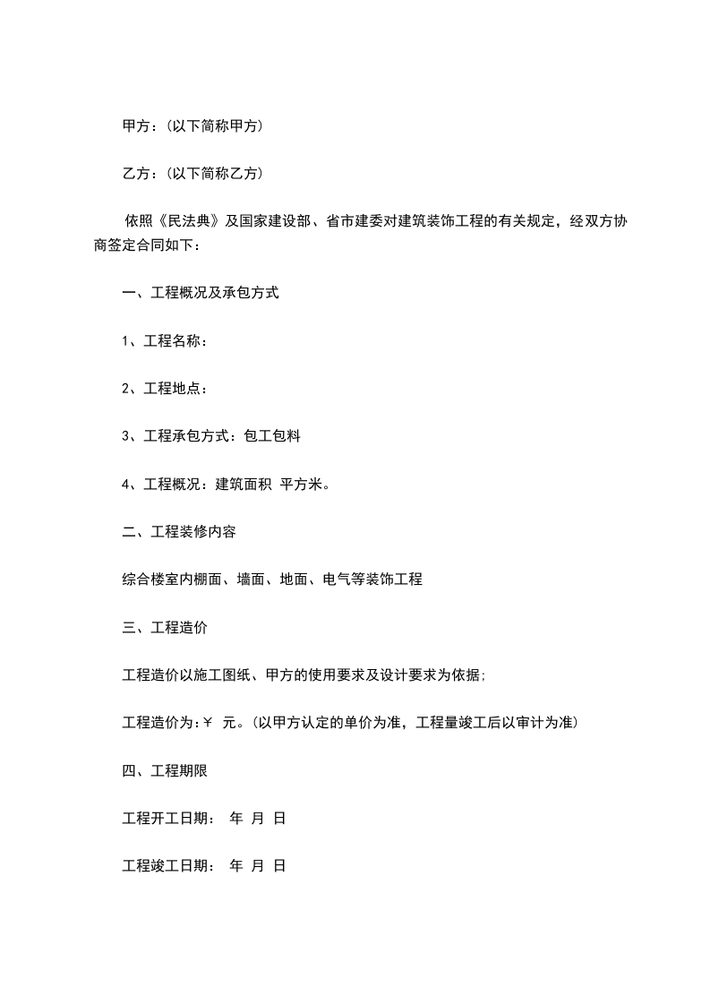 依照《民法典》及国家建设部、省市建委对建筑装饰工程的有关规定,经双方协商签定合同如下: