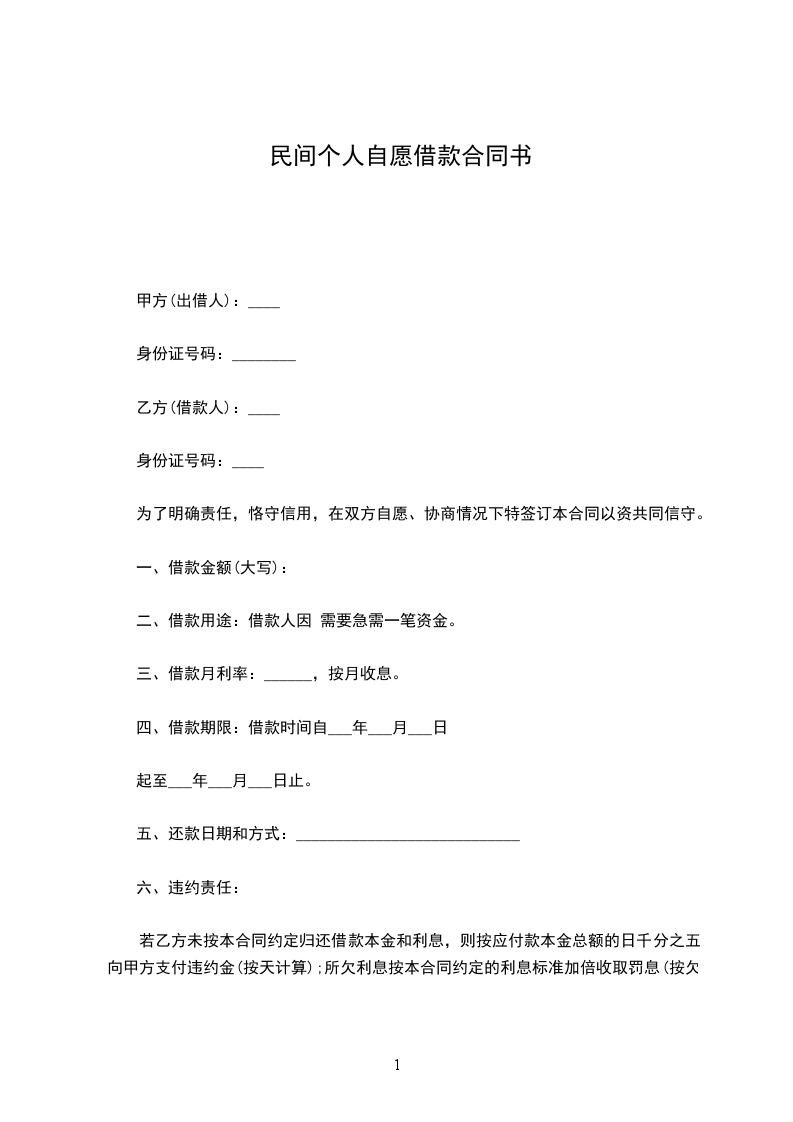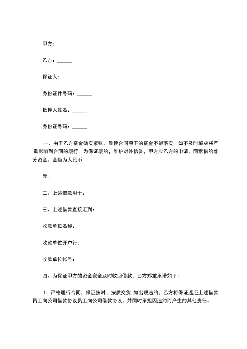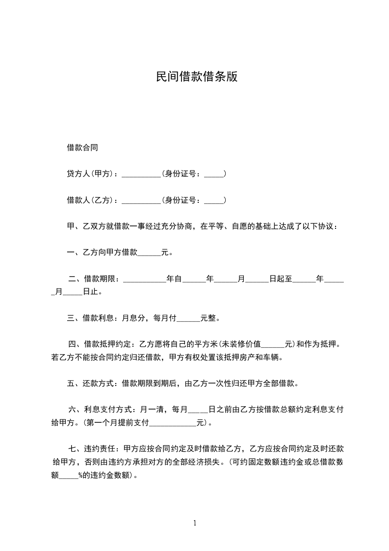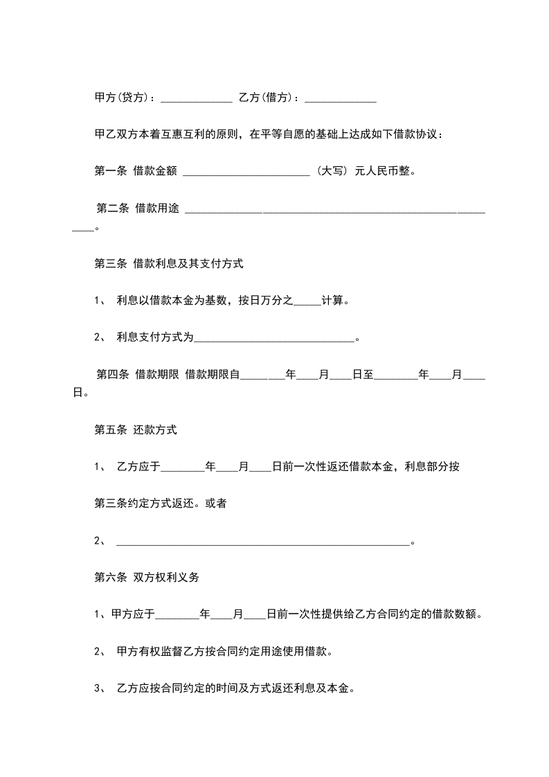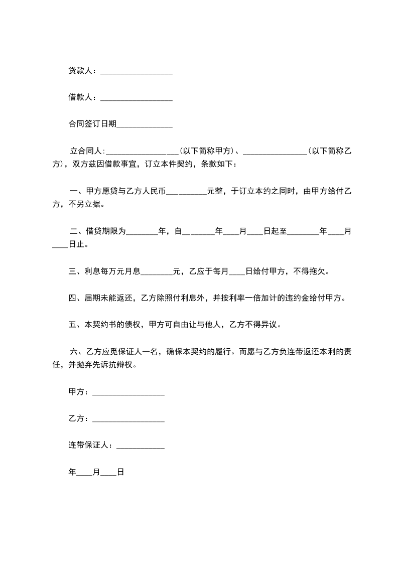 一、甲方愿贷与乙方人民币__________元整,于订立本约之同时,由甲方给付乙方,不另立据。