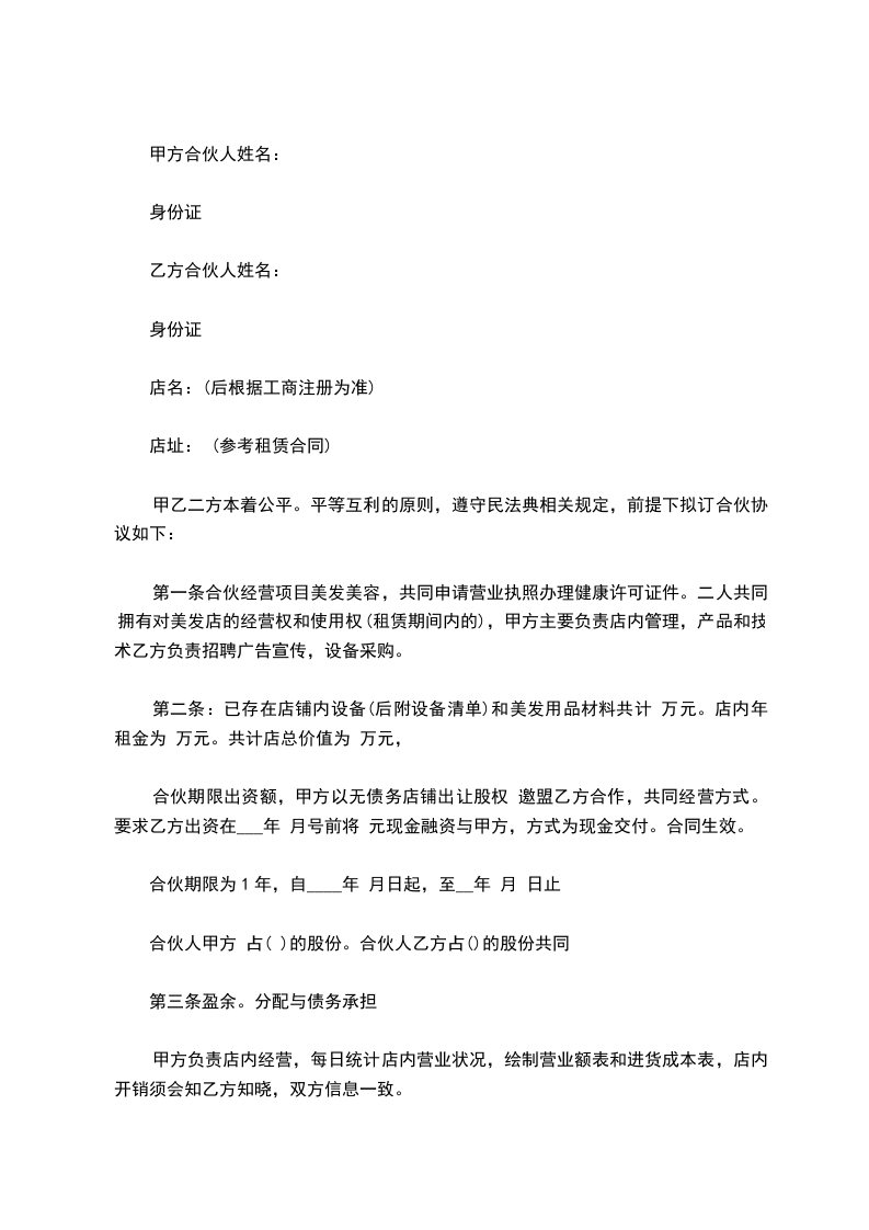 第一条合伙经营项目美发美容,共同申请营业执照办理健康许可证件。二人共同拥有对美发店的经营权和使用权(租赁期间内的),甲方主要负责店内管理,产品和技术乙方负责招聘广告宣传,设备采购。