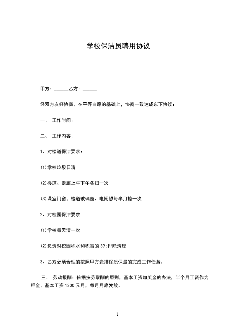 三、 劳动报酬:依据按劳取酬的原则,基本工资加奖金的办法,半个月工资作为押金,基本工资1300元月,每月月底发放。