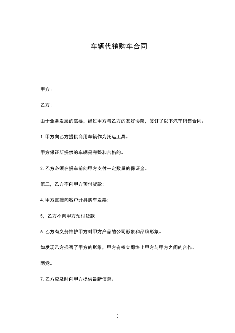一、甲方向乙方提供商品车作为代销车辆,甲方保证所提供的车辆为手续完整、质量合格的车辆。