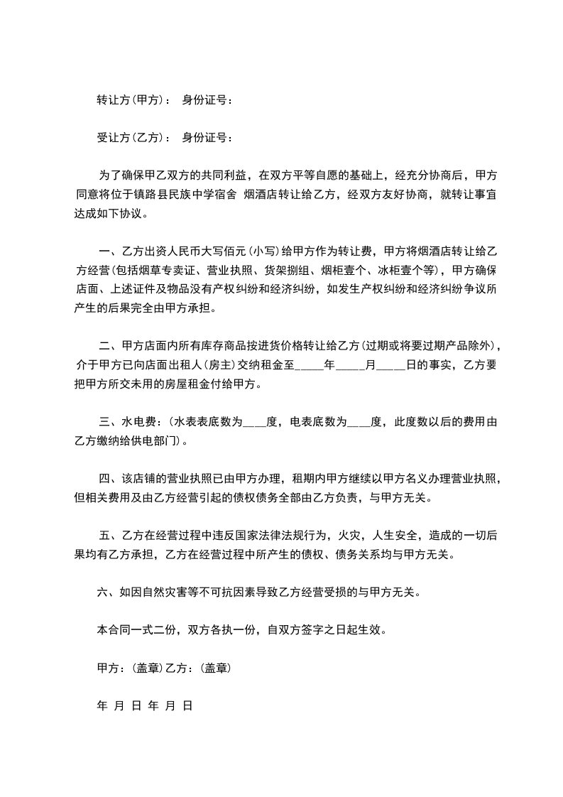 一、乙方出资人民币大写佰元(小写)给甲方作为转让费,甲方将烟酒店转让给乙方经营(包括烟草专卖证、营业执照、货架捌组、烟柜壹个、冰柜壹个等),甲方确保店面、上述证件及物品没有产权纠纷和经济纠纷,如发生产权纠纷和经济纠纷争议所产生的后果完全由甲方承担。
