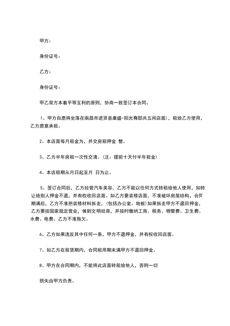 8、甲方在合同期内,不能将此店面转租给他人,否则一切