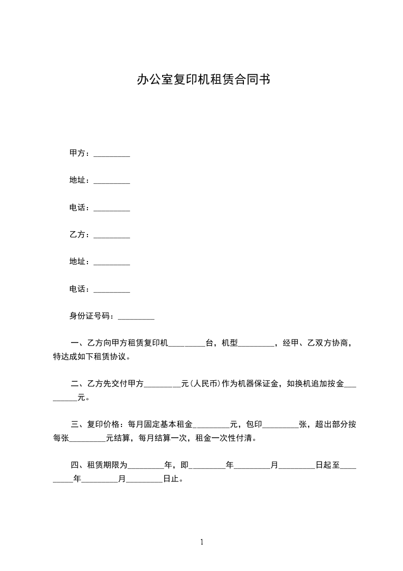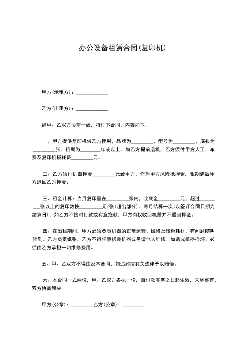 一、乙方向甲方租赁复印机_________台,机型_________,经甲、乙双方协商,特达成如下租赁协议。