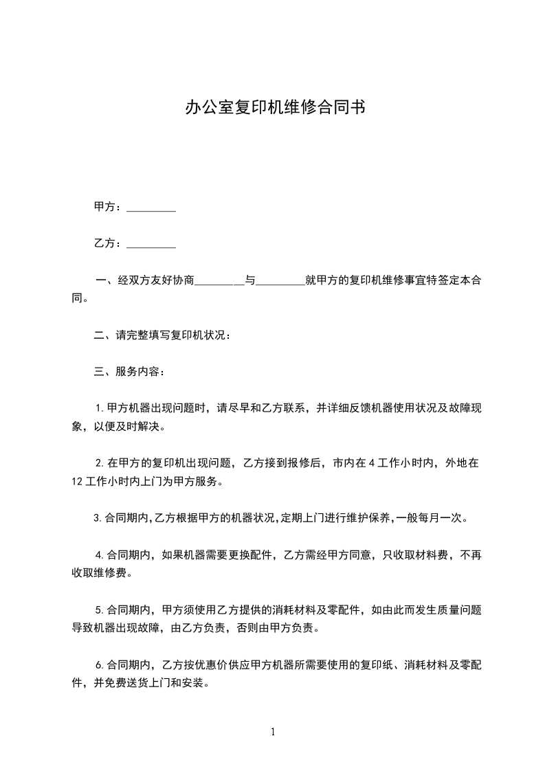 五、甲方责任:在租赁合同期内,维修、耗材、配件甲方负责(纸张除外)免费为乙方培训操作人员,提供咨询服务。当机器出现临时故障时,甲方在接到乙方通知后24小时内保证机器正常,如遇到特殊故障(在两天内修复不成),甲方提供另一台性能完好的机器给乙方使用,直到机器修复为止。