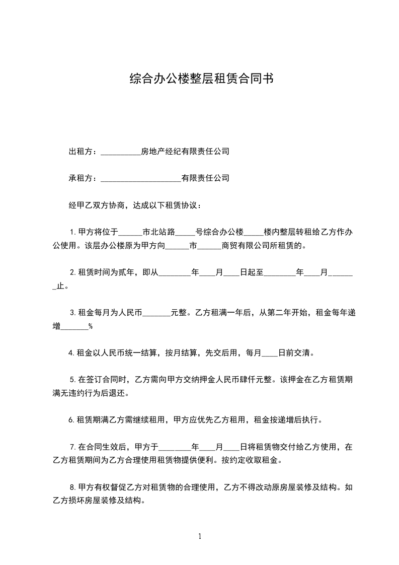 1.甲方将位于______市北站路_____号综合办公楼_____楼内整层转租给乙方作办公使用。该层办公楼原为甲方向______市______商贸有限公司所租赁的。