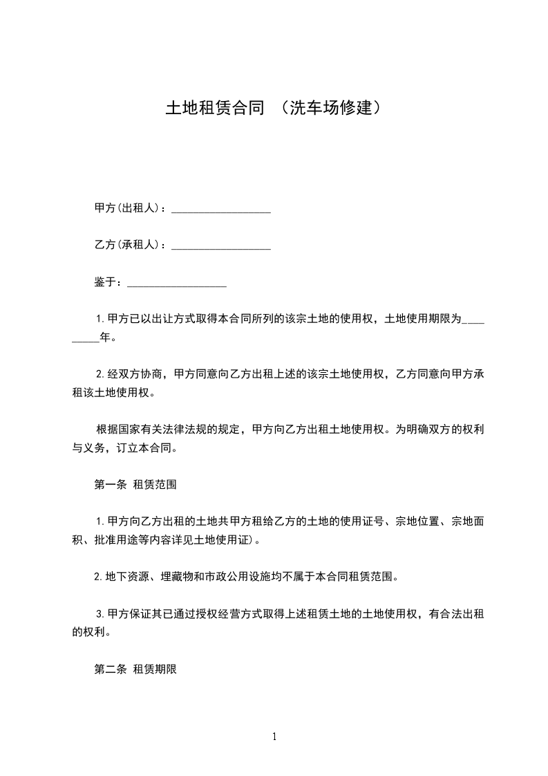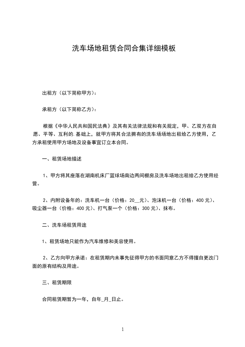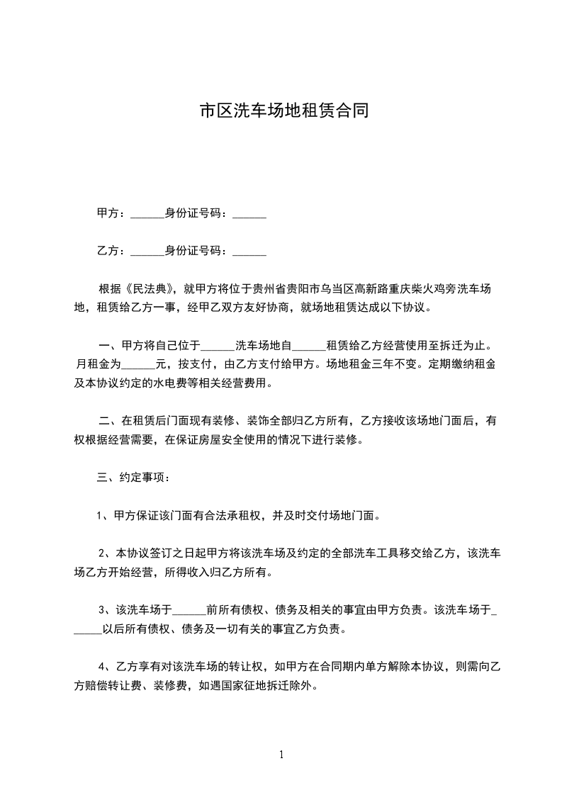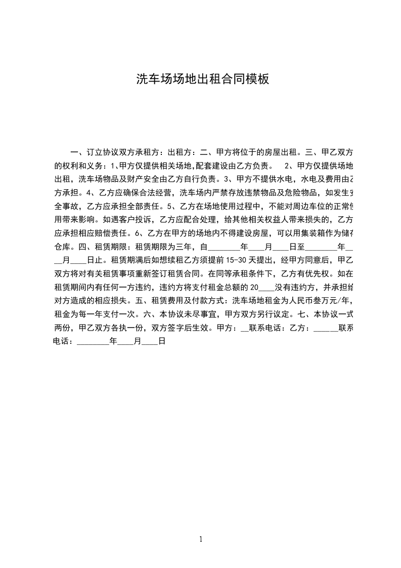 一、甲方将其所在位于 县 镇 路 号的5亩洗车场地出租给乙方使用,乙方用于经营专业汽车美容之用。