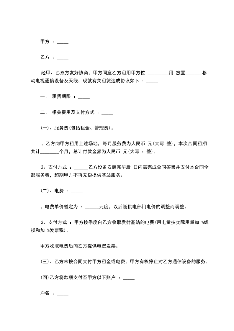 2.支付方式:甲方按季度向乙方收取发射基站的电费(用电量按实际用量加_______%线损和加_______%发票税)。甲方收取电费后向乙方提供电费发票。