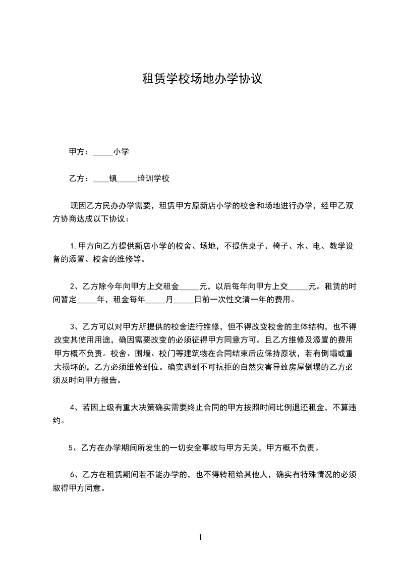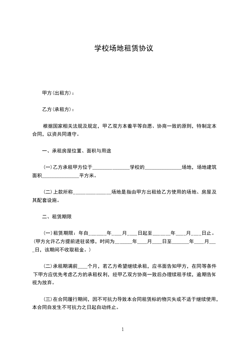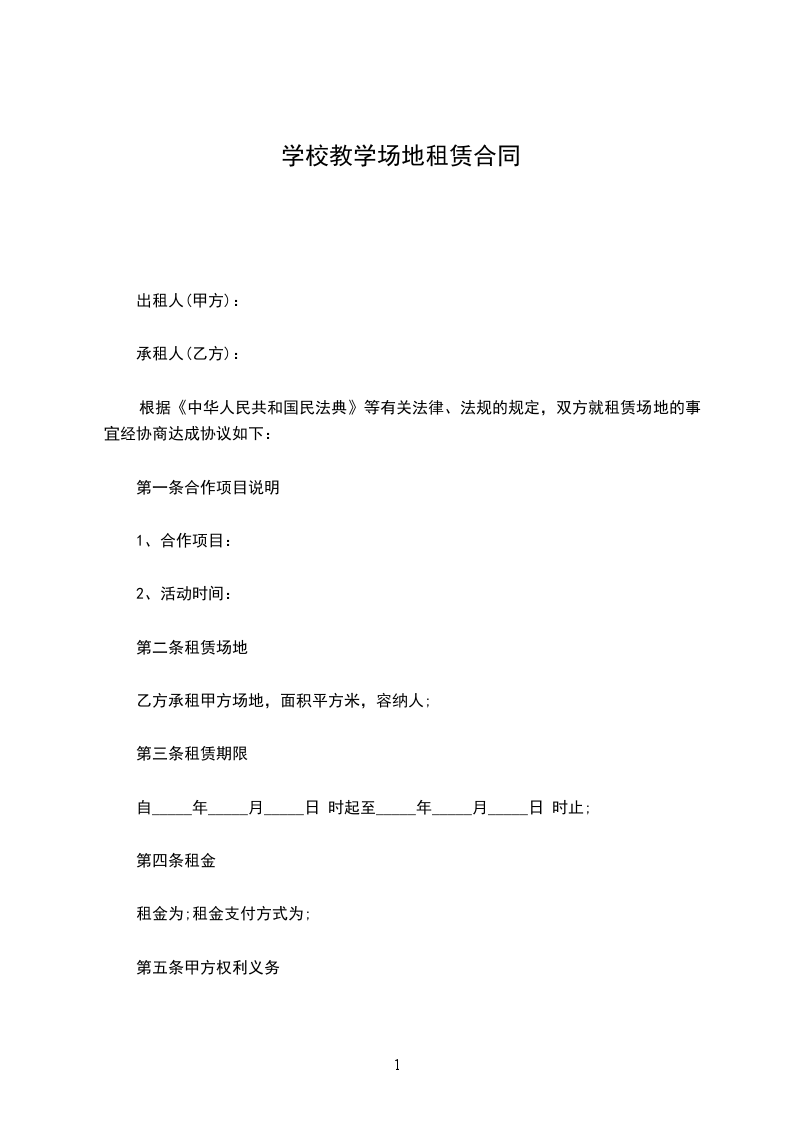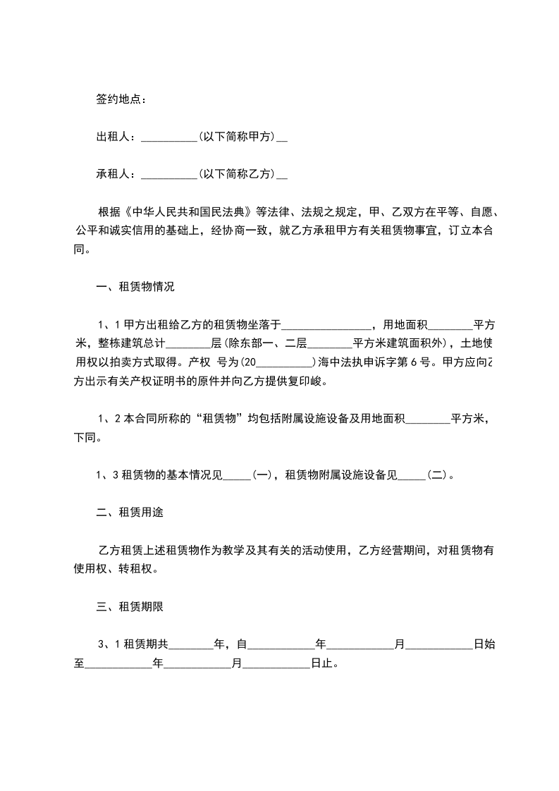 根据《中华人民共和国民法典》等有关法律、法规的规定,遵循平等、自愿、公平和诚实的原则,双方就租赁场地从教育等事宜经协商达成协议如下: