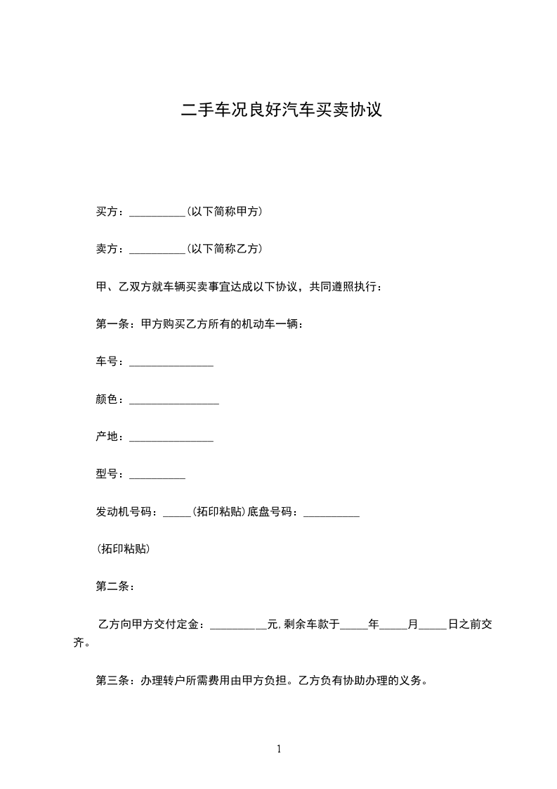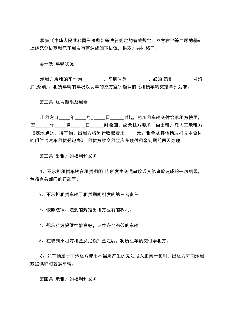 承租方所租的车型为_________,车牌号为_________,必须使用_________号汽油(柴油)。租赁车辆的车况以发车的双方签字确认的《租赁车辆交接单》为准。