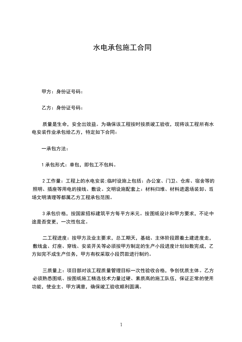 质量是生命,安全出效益。为确保该工程按时按质竣工验收,现将该工程所有水电安装作业承包给乙方,特定如下合同: