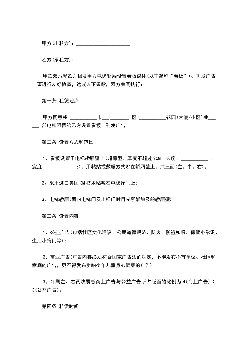 2、乙方在与甲方合作期间,如遇电梯厢改建、翻建不能正常使用时,甲方应提前通知乙方,由双方共同协商解决方案。甲方有义务确保电梯内乙方装饰刊登的广告不被撕毁或被偷窃、遗失。